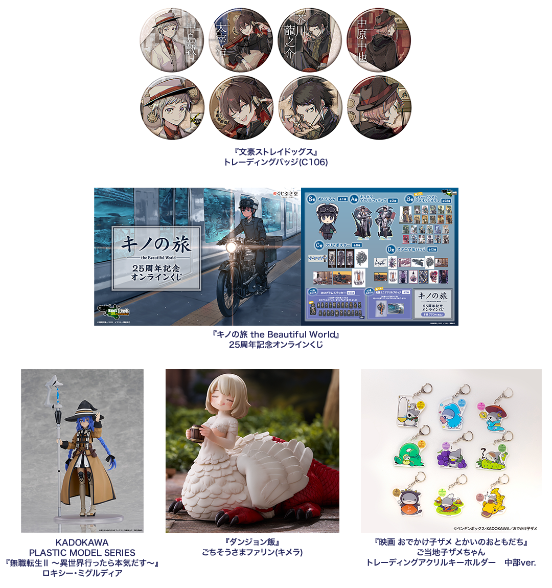 KADOKAWAグループのアニメ、書籍、コミックなどのIPの最大化の一環として、MDの自社展開や他社へのライツアウトを行っています。国内外で人気の高い缶バッジ、フィギュア・プラスチックモデルなどのグッズから、アパレル、文具、菓子まで幅広く企画し、直営ECストア、オンラインくじストア、アニメ専門店、書店、イベント物販など、国内のみならず、全世界に向けてグローバルな販売を行っています。