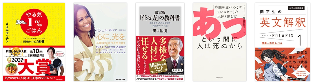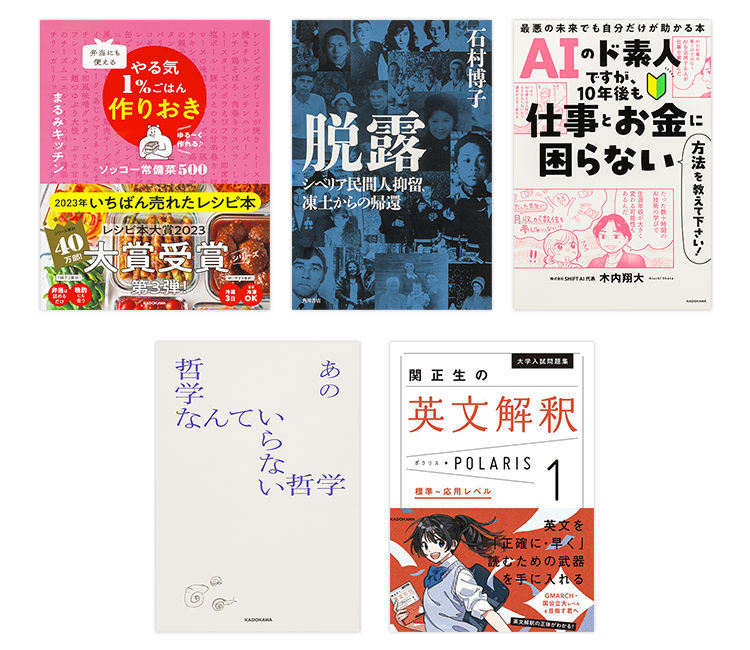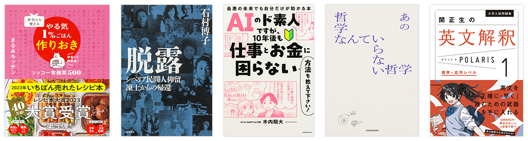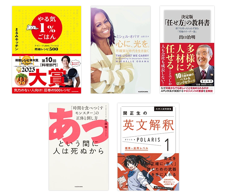 「働く」「暮らす」「学ぶ」の観点から、読者の生活・教養をより豊かにするコンテンツを提供。ビジネス書、生活実用書、ノンフィクション、翻訳書、コミックエッセイ、写真集、学習参考書、語学書、学術書、辞書などジャンルは多岐にわたり、角川新書、角川ソフィア文庫、角川選書のレーベルのほか、セミナーなどのイベントも行っています。
