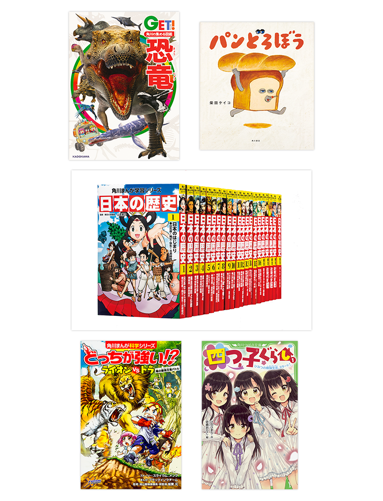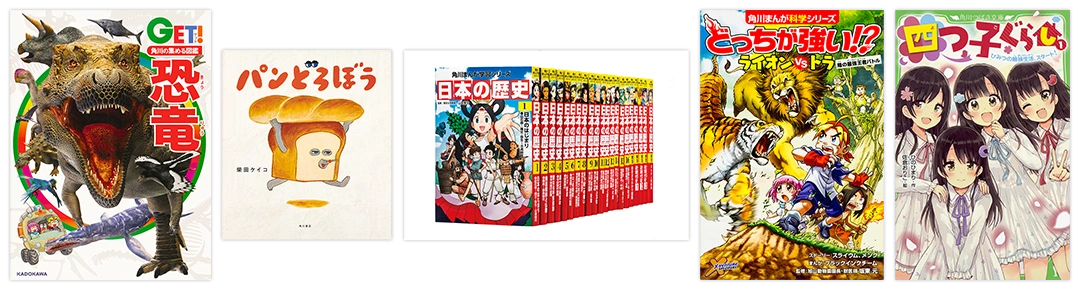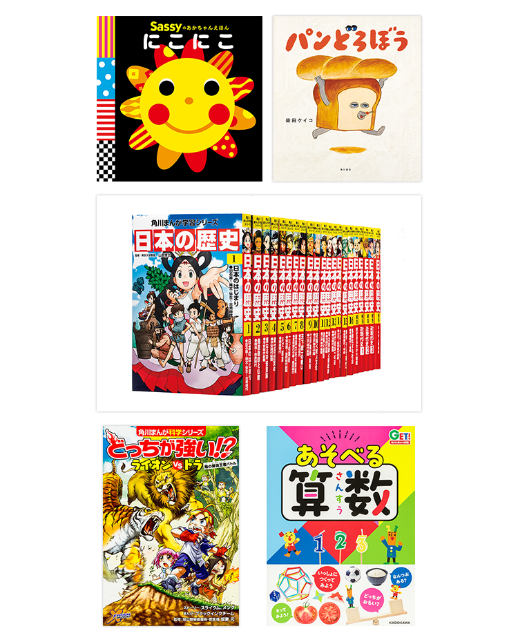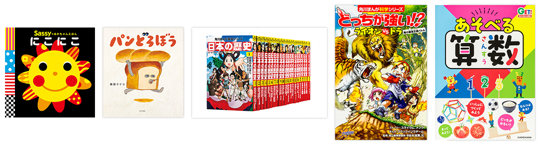 0歳~未就学児向け絵本から、キャラクター書籍、「日本の歴史」などの「角川まんが学習シリーズ」、児童文庫レーベル「角川つばさ文庫」まで、子どもの発達や成長の段階に合わせた素敵な読書体験を提供するラインアップを刊行しています。