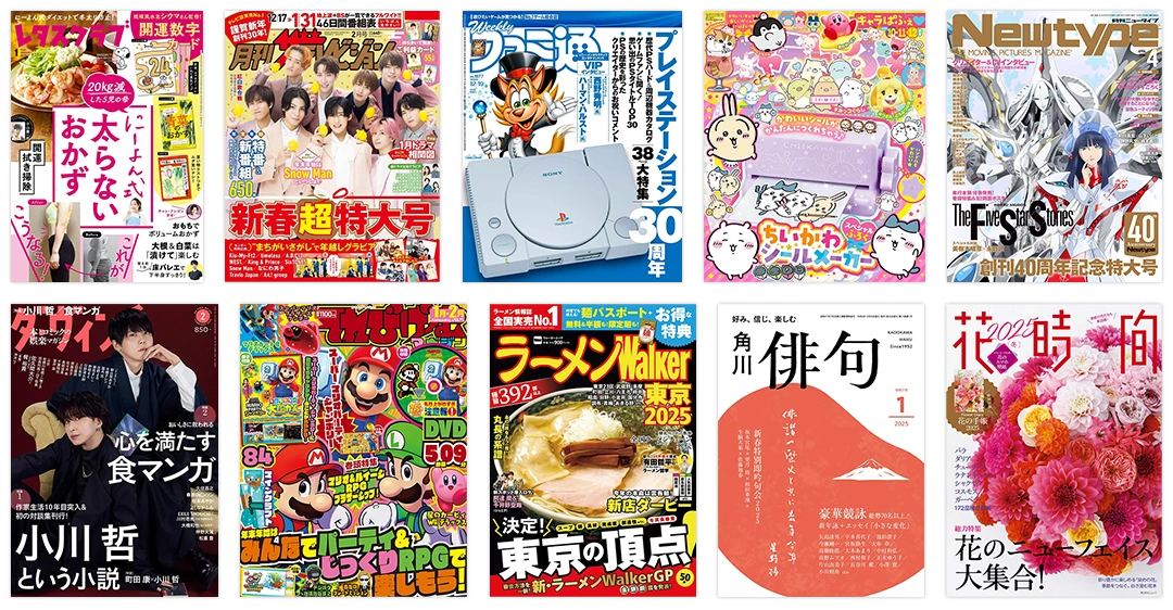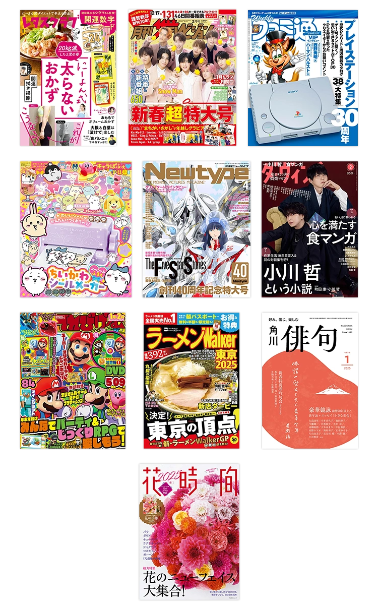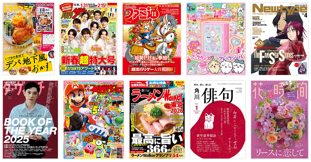 生活情報誌「レタスクラブ」、テレビ情報誌「月刊ザテレビジョン」、ゲーム総合誌「週刊ファミ通」、女の子のためのキャラクター&ゲーム情報誌「キャラぱふぇ」、最新のアニメ情報を網羅する「ニュータイプ」、旬の本とコミックを紹介する「ダ・ヴィンチ」など、さまざまな世代・趣味の方々に向けて発信しています。