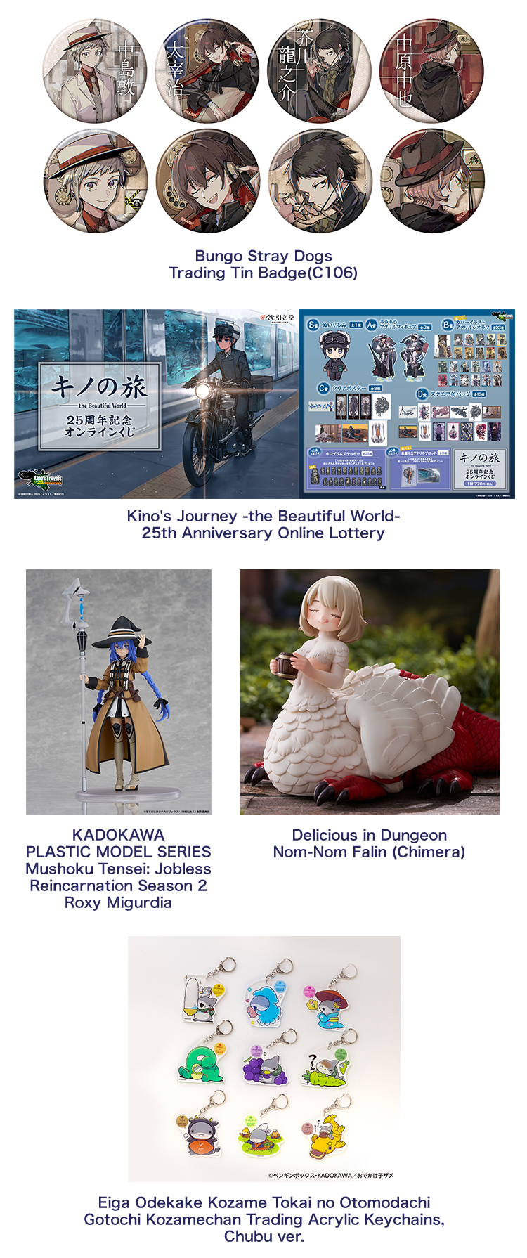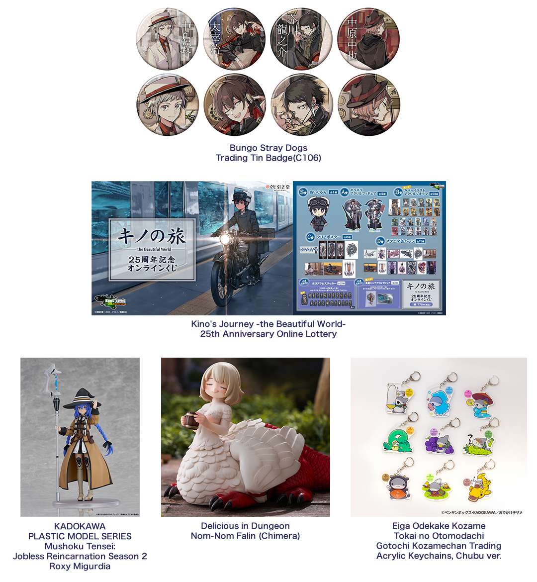 The KADOKAWA Group produces its own merchandise and sells rights to its IP for merchandise production in an effort to maximize the intellectual property, including anime, books, and comics. We plan a broad range of merchandise, from domestically and globally popular metal badges, figures and plastic models to clothing, stationery, and confectioneries. They are domestically and globally made available at KADOKAWA’s e-commerce store, online lottery stores, animation specialty stores, bookstores, event venues and many other locations.