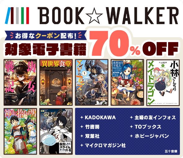 総合電子書籍ストアBOOK☆WALKERで1月29日(土)・30日(日)の2日間使用できる、対象電子書籍70%OFFクーポンをプレミアム会員特典として配布します。第1弾ではKADOKAWA作品限定でしたが、今回対象出版社を拡大し、主婦の友インフォス、竹書房、TOブックス、双葉社、ホビージャパン、マイクロマガジン社も対象となり、幅広い作品で利用できます。
