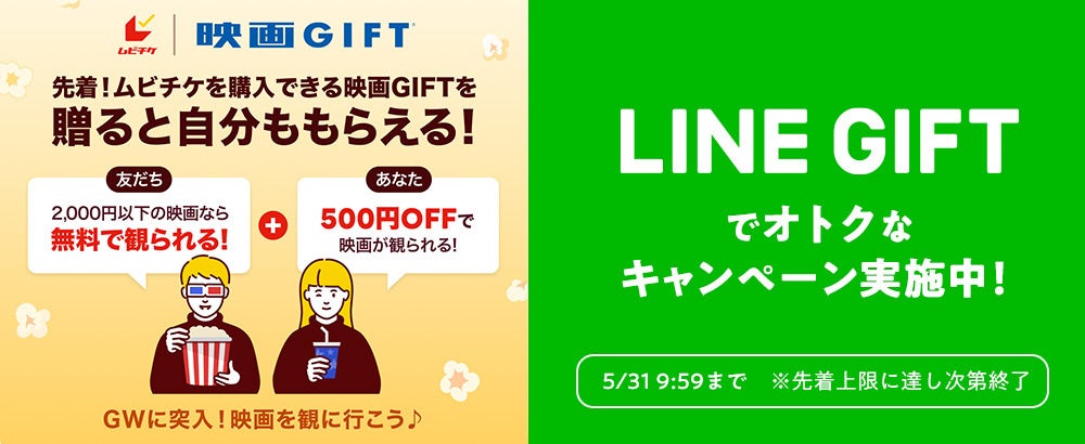 概要:映画GIFT2,000円分をLINEギフトの公式キャンペーンページから購入しプレゼントすると、ご自身にも映画GIFT500円分をプレゼント