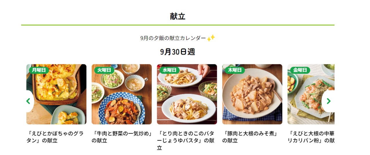 今回のリニューアルでは、そんなへとへとさんが「調子のいい毎日」を目指せるサイトに生まれ変わりました。レタスのグリーンを基調としたポップでポジティブな色合い、直感的でわかりやすい操作性など、ユーザビリティの向上を図り、「誰でもわかりやすく簡単につくれる美味しいプロのレシピ」や「へとへとな毎日をラクにしてくれる生活に役立つ情報」はそのままに、より元気にそしてごきげんになれるサイトを実現しました。