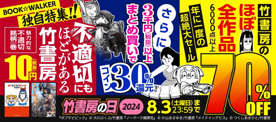 株式会社ブックウォーカー(本社:東京都千代田区 代表取締役社長:森田岳)は、総合電子書籍ストアBOOK☆WALKER(以下、BOOK☆WALKER)にて、8月1日の竹書房の日を記念して、BOOK☆WALKERが独自目線で選ぶ『メイドインアビス』や『ポプテピピック』などの”魅力的な不適切銘柄”16作品が1巻10円(税抜)となる「竹書房の日2024~不適切にもほどがある竹書房~」企画を2024年8月1日(木)より実施します。また、竹書房作品を取り扱う書店共通で行われる6,000点以上の竹書房作品が70%OFFとなる「竹書房の日2024」キャンペーンも合わせて実施します。