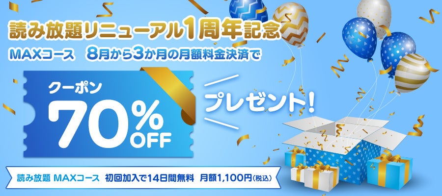 読み放題リニューアル1周年を記念し、「読み放題 MAXコース」を3ヶ月継続決済された方へ、電子書籍の購入に利用できる70%OFFクーポンプレゼントも同時期開催いたします。