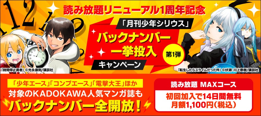 特別企画として、かねてより「読み放題で読みたい」とリクエストの多かった『転生したらスライムだった件』の掲載誌である、『月刊少年シリウス』を配信いたします。BOOK☆WALKER読み放題で『月刊少年シリウス』が読めるのは今回が初となります。