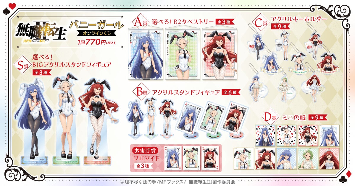 <「無職転生Ⅱ ~異世界行ったら本気だす~」 バニーガールオンラインくじ 概要> 販売期間:2024年10月17日(木)12:00~2024年11月14日(木)11:59 販売価格:1回 770円(税込)※別途発送手数料が掛かります。 |