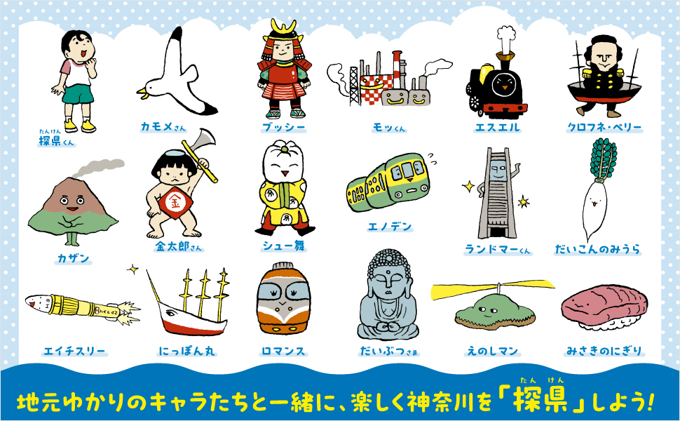 社会科に興味津々の「探県(たんけん)くん」をはじめ、神奈川の県の鳥であるカモメ、京浜工業地帯をイメージしたキャラ、全国消費ナンバーワンのシューマイをモチーフとしたキャラなど、神奈川にゆかりのある様々なオリジナルキャラクターたちが楽しくナビゲート。イラストは人気イラストレーターの伊藤ハムスターさんによるものです。