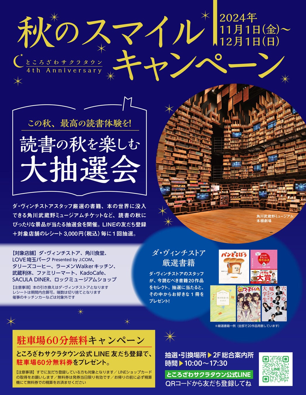株式会社KADOKAWA(本社:東京都千代田区、取締役 代表執行役社長 CEO:夏野剛、以下 KADOKAWA)は、埼玉県所沢市ところざわサクラタウンにて、2024年11月1日(金)~12月1日(日)の期間、日ごろご愛顧いただいている皆様に感謝の気持ちを込めて「読書の秋を楽しむ大抽選会」「駐車場60分無料券プレゼント」の2つの特典をご利用いただける「秋のスマイルキャンペーン」を実施します。お得がいっぱいの本期間、ところざわサクラタウンでお楽しみください。