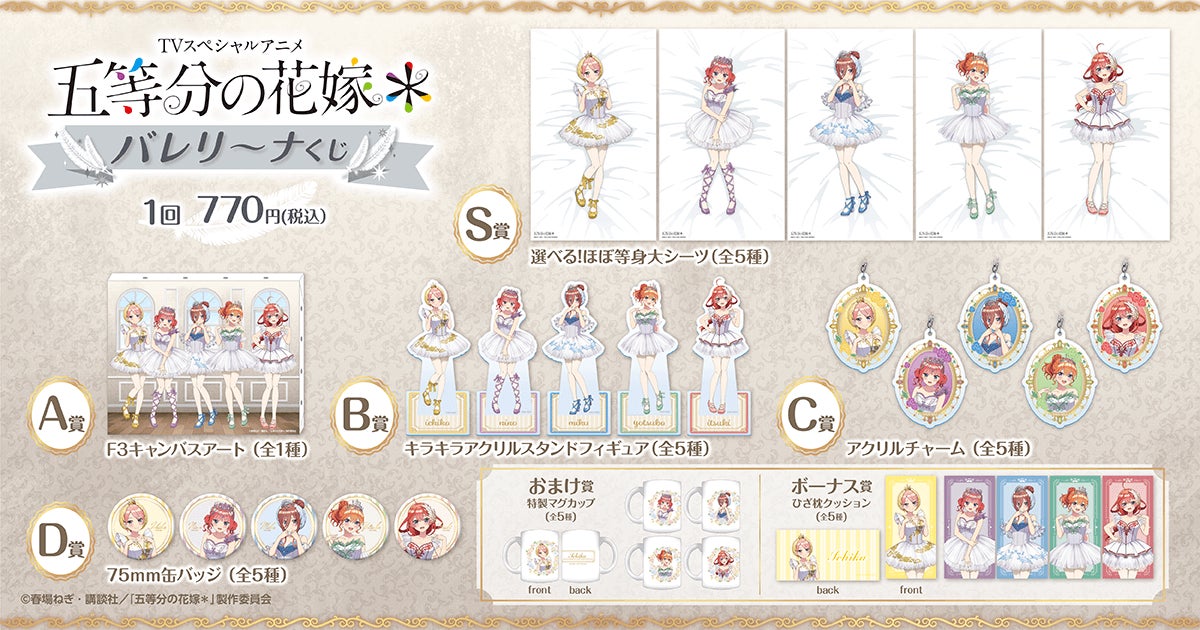 <TVスペシャルアニメ『五等分の花嫁*』バレリーナくじ 概要> 販売期間:2024年11月12日(火)12:00~2024年12月7日(土)11:59 販売価格:1回 770円(税込)※別途発送手数料が掛かります。 |