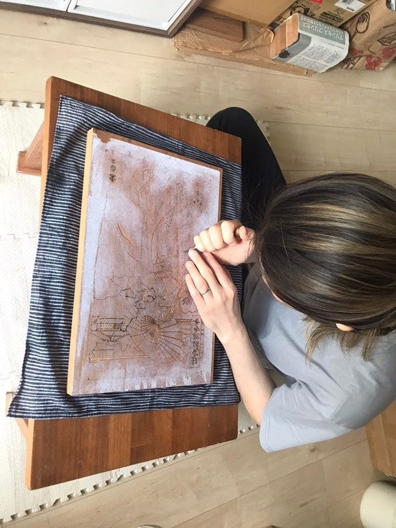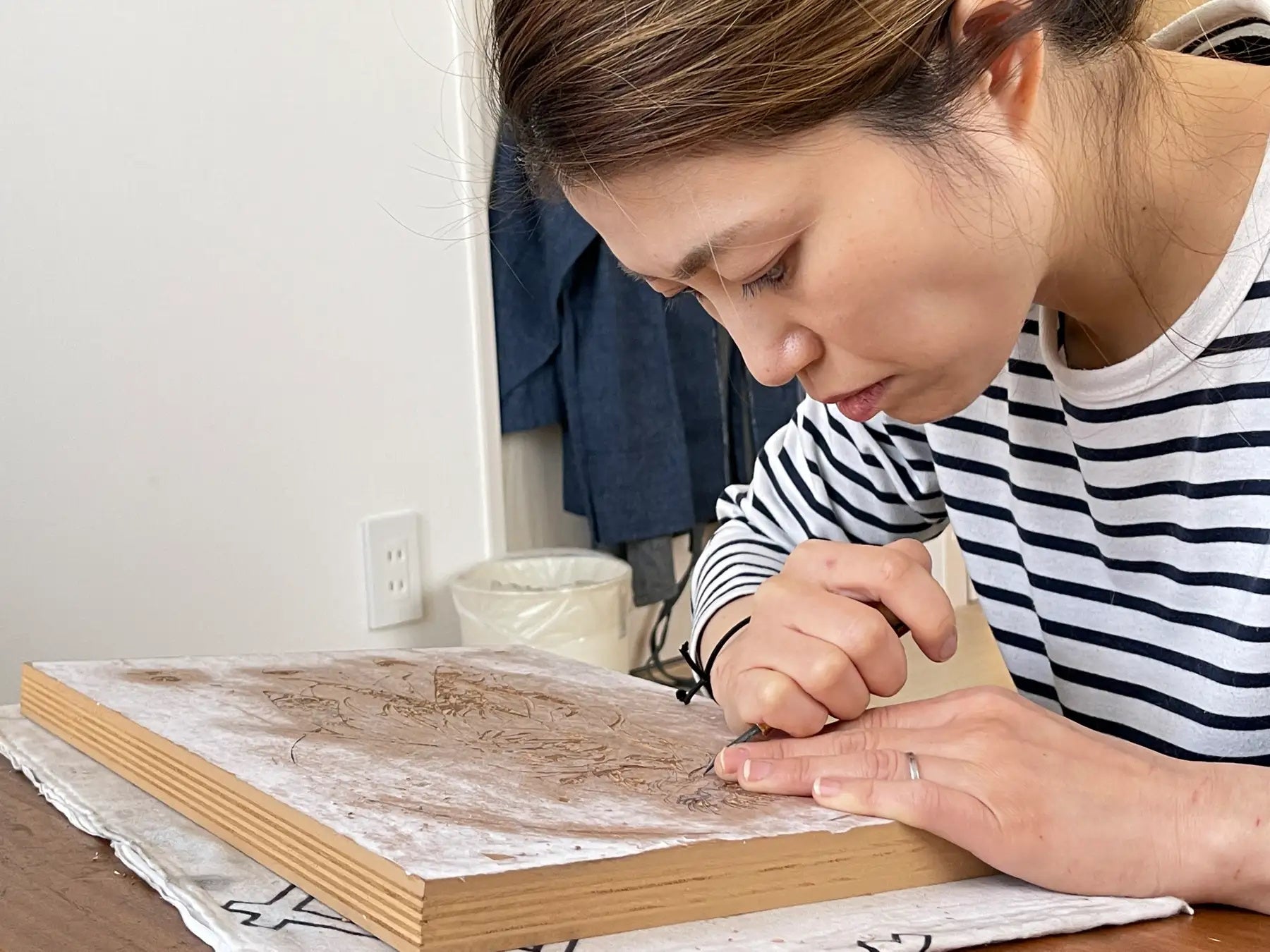 版木上に美麗イラストをやわらかく繊細に彫り出していきます。