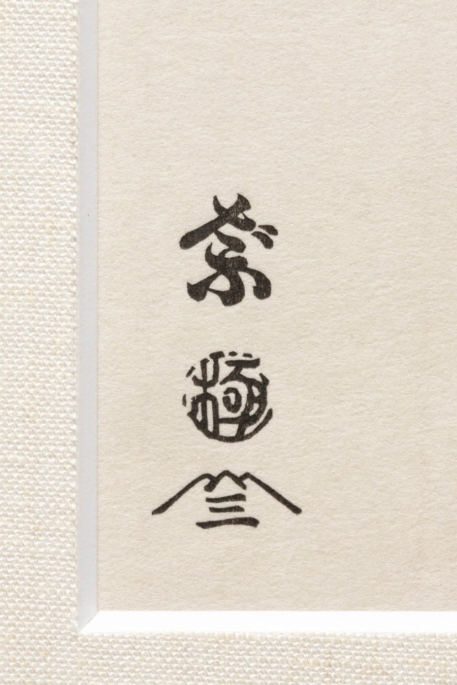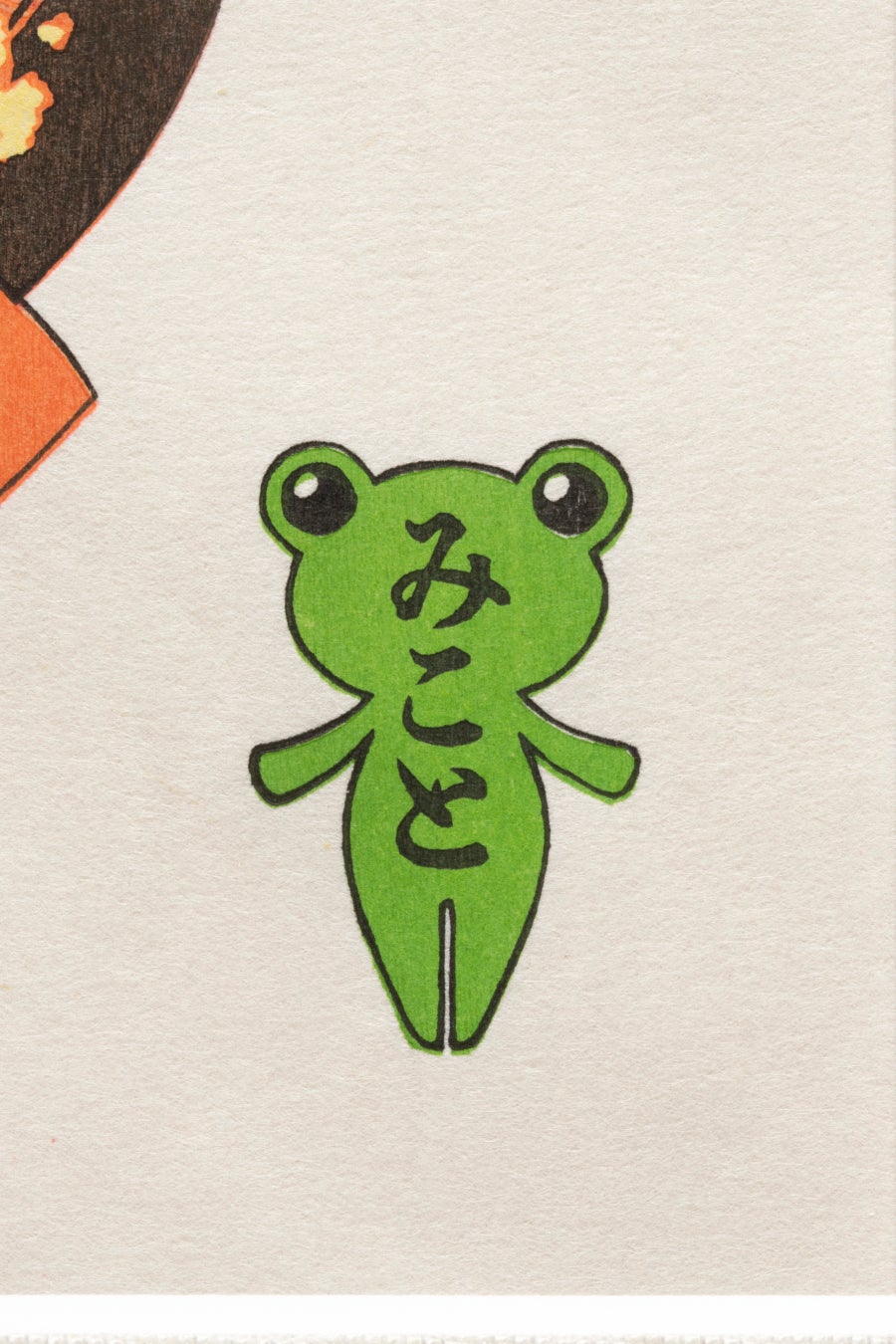 赤い傘と華やかな着物を纏った御坂美琴。この浮世絵のために描き下ろされた美麗なイラストを、彫りは永井 沙絵子氏が手掛け、摺りは岡田 拓也氏が手掛けています。隅にひっそりとデザインされたゲコ太もこだわりのポイントです。