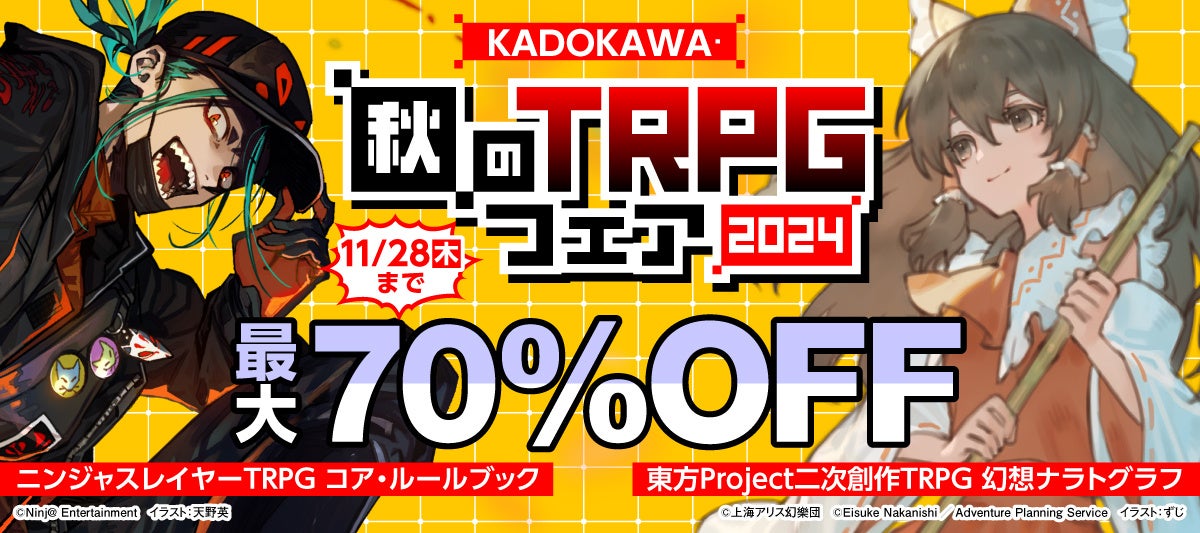 本キャンペーンでは、『ニンジャスレイヤーTRPG コア・ルールブック』や、BOOK☆WALKERでの割引が初となる『東方Project二次創作TRPG 幻想ナラトグラフ』、『夜のあしあと』など、KADOKAWAのTRPG関連作品300点以上が最大70%OFFとなります。