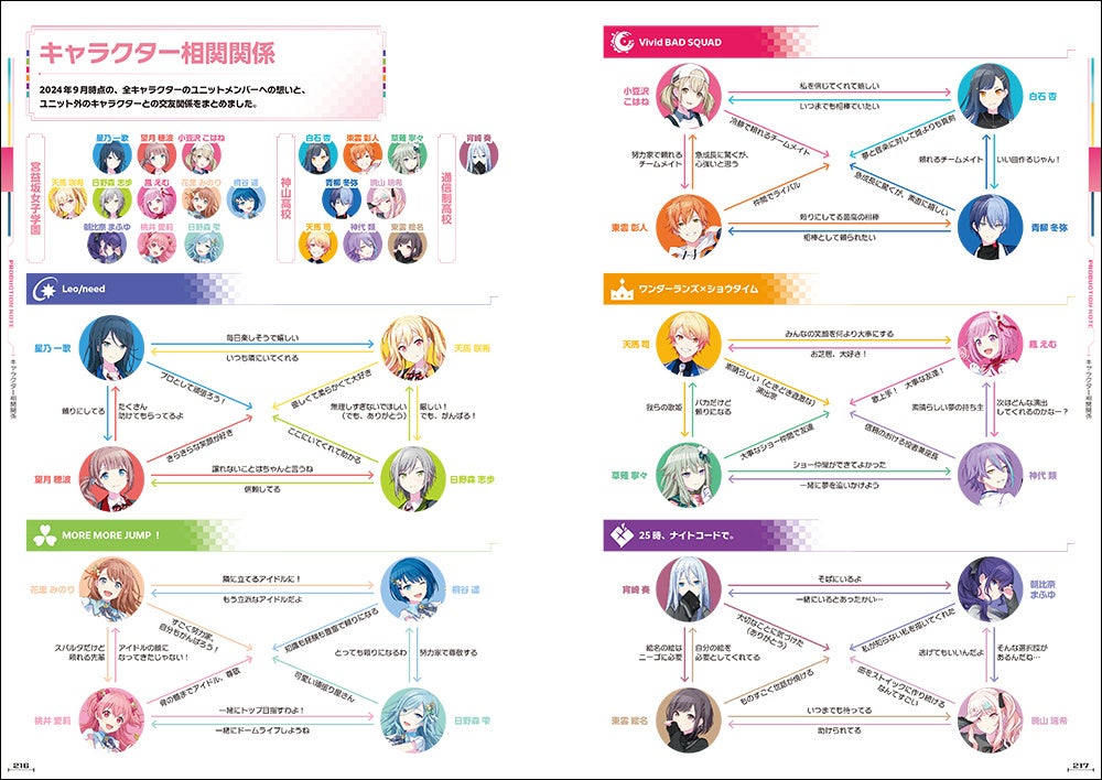 また、ストーリー展開に応じて変わりゆく登場人物たちの関係性、交友関係についても掲載。相関図やお互いへの想いが窺い知れる情報も掲載されています。