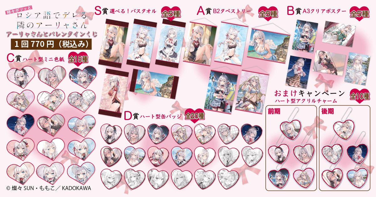株式会社KADOKAWA(本社:東京都千代田区、取締役 代表執行役社長 CEO:夏野 剛、以下 KADOKAWA)は、運営するオンラインくじサービス「くじ引き堂」において、『時々ボソッとロシア語でデレる隣のアーリャさん』の豪華賞品が手に入る<『時々ボソッとロシア語でデレる隣のアーリャさん』アーリャさんとバレンタインくじ>を、2025年2月14日(金)12時より販売します。