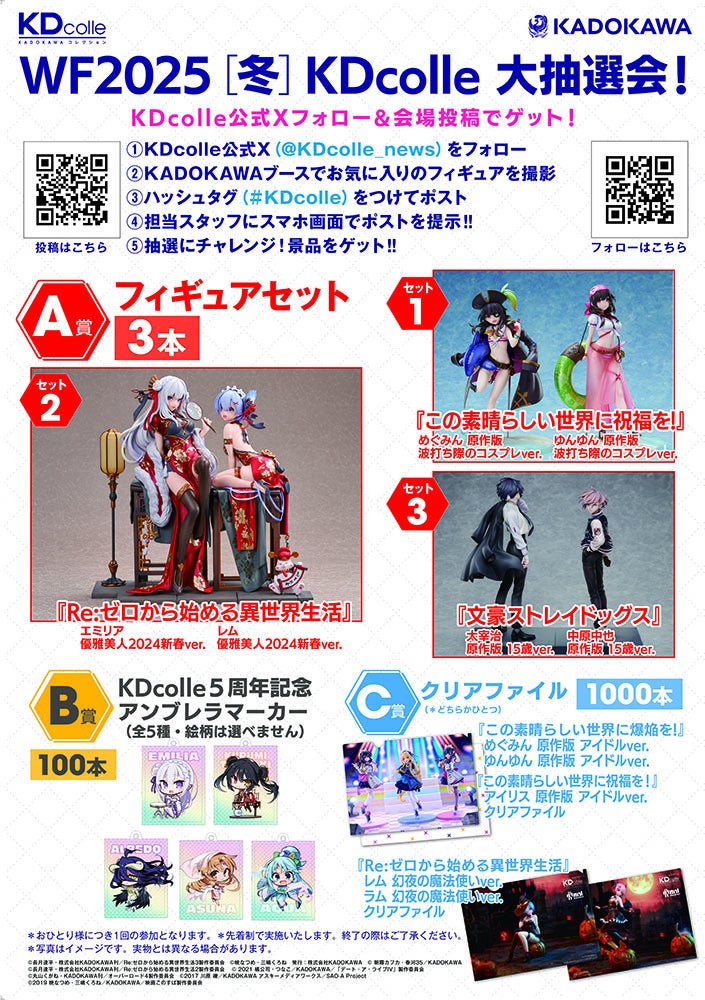 2/9(日)開催の「ワンダーフェスティバル2025[冬]会場では、フィギュアセットや、こもわた遙華先生によるイラスト入りKDcolle5周年記念アンブレラマーカーなどが当たる大抽選会を実施します! KDcolle公式X(@KDcolle_news)をフォローの上、KADOKAWAブースへぜひお越しください。