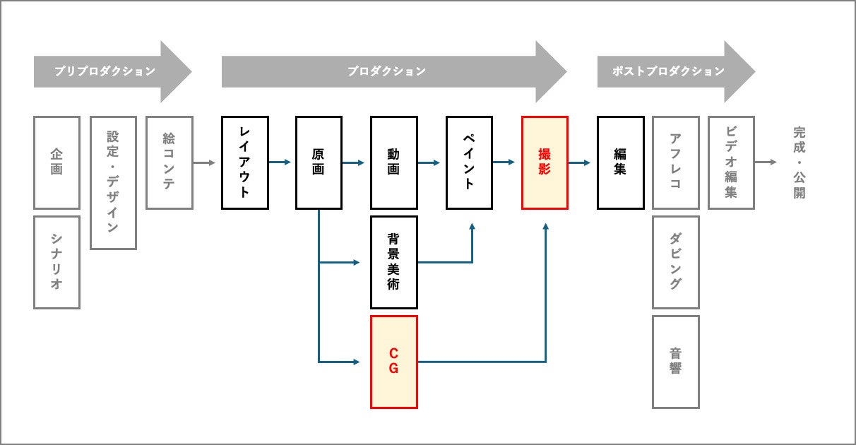 2012年創業のチップチューンは、「撮影」と「CG」を中心に、背景美術、ペイント(彩色)などを担うアニメ制作スタジオです。アニメ制作における「撮影」とは、動画(セル)、背景、CGデータなどを合成して一つの映像にする工程のことで、エフェクトやフィルターなどを加える工程も担っています。原画や映像を制作する過程(プロダクション)の最終プロセスにあたり、作品のクオリティに直結する重要な工程です。チップチューンは業界トップクラスの撮影監督と、高い知見とスキルを獲得した優秀なスタッフが多数在籍しており、撮影におけるクオリティの高さと制作力が評価されています。年間10作品程度に携わっており、映画『ペンギン・ハイウェイ』やTVアニメ『幼女戦記』、『無職転生 ~異世界行ったら本気だす~』シリーズなど当社原作のアニメ作品のほか、『ブルーロック』や『BLUE GIANT』、『青の祓魔師 島根啓明結社篇』、『転生したらスライムだった件』など数々のメジャータイトルにおいて撮影監督を担当した実績があります。