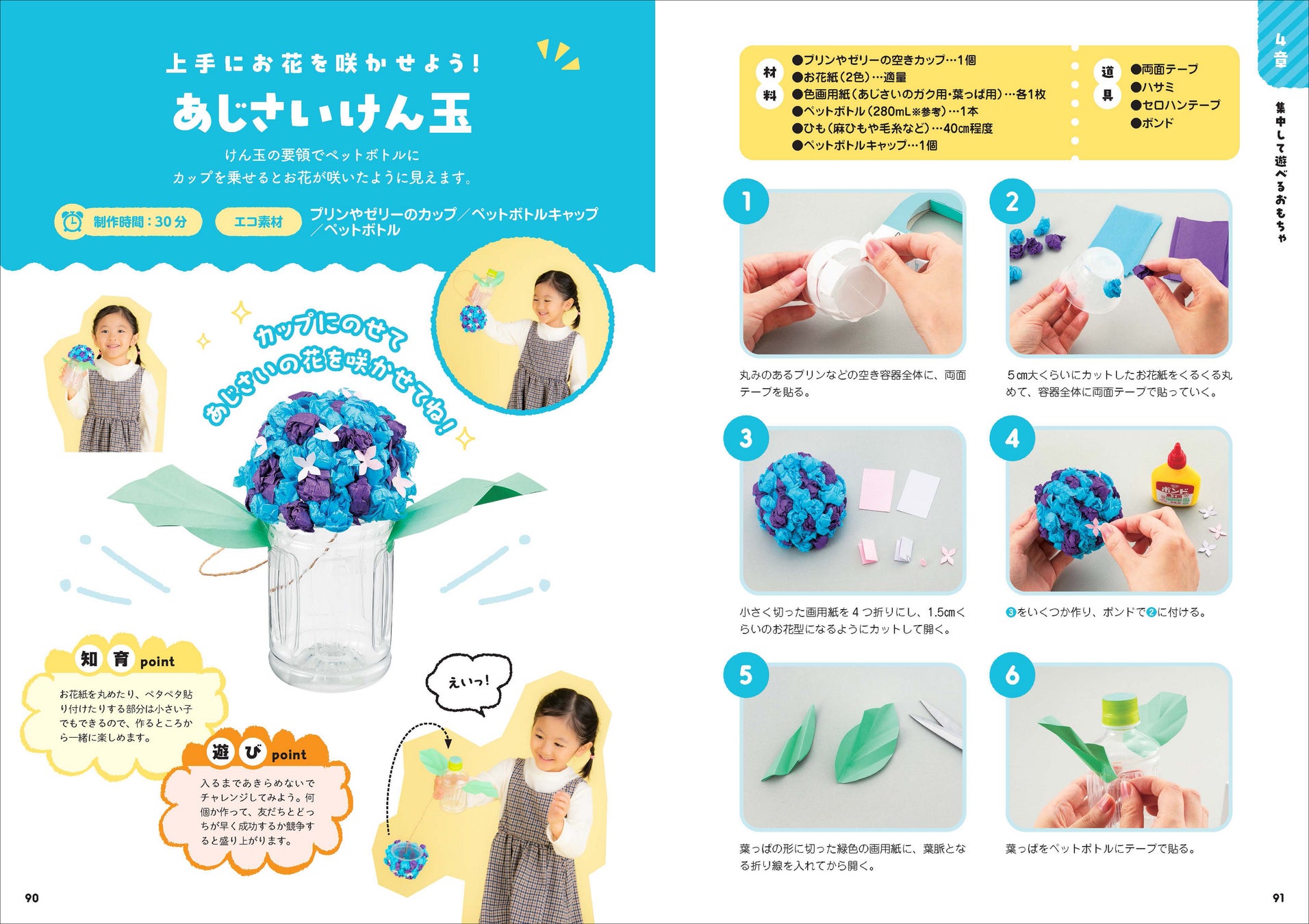 本書は、普段工作をしない方や工作が得意ではない方も子どもと一緒に楽しめる簡単な手作りおもちゃの作り方を紹介しています。工程は、すべて手元写真とともに紹介しており、SNSの動画だけでは迷いがちな部分までじっくり確認することができる構成になっています。また、すべての手作りおもちゃに「知育point」「遊びpoint」を入れており、飽きずに長く遊んで子どもの知育につながる提案をしています。さらに、廃材や身近な材料だからこそアレンジや飾りつけを楽しめる作品が多いため、工作の宿題や保育園の工作に生かせるような「装飾の工夫ポイント」を一部の作品で掲載しており、さまざまな応用が可能になっています。