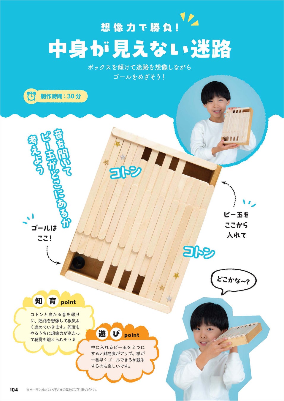 本書は、SNSで400万回以上視聴された人気作品に加え、新作品を含む44点を掲載。身近な材料でお手頃に作れ、子どもが夢中で遊ぶのが特徴です。新作品の「中身が見えない迷路」は100円ショップの材料で作れて、材料費はたったの300円。迷路の中身が見えないため、ビー玉が転がる音を頼りにゴールを目指す新感覚のおもちゃです。本の発売前から「中身が見えない迷路」で遊ぶ動画がSNSで70万回以上再生されるなど、注目を集めています。