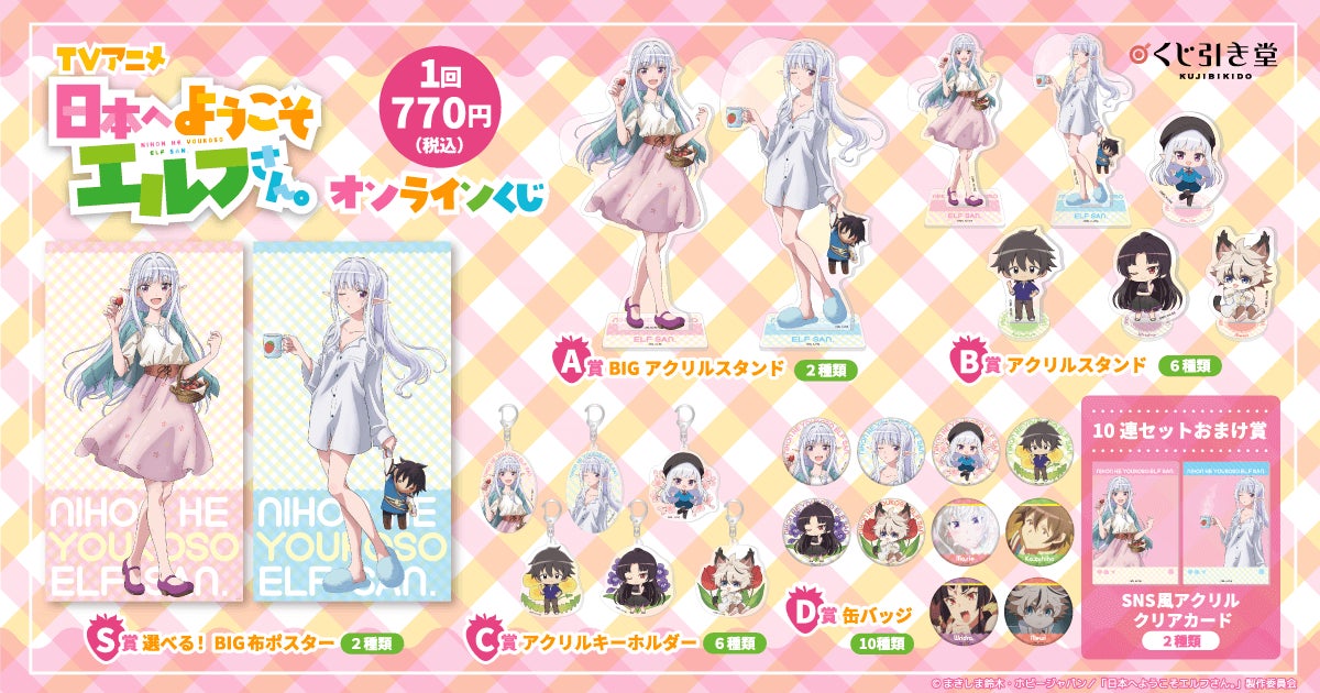 株式会社KADOKAWA(本社:東京都千代田区、取締役 代表執行役社長 CEO:夏野 剛、以下 KADOKAWA)は、運営するオンラインくじサービス「くじ引き堂」において、『日本へようこそエルフさん。』の豪華賞品が手に入る<TVアニメ「日本へようこそエルフさん。」オンラインくじ>を、2025年4月22日(火)17時より販売します。