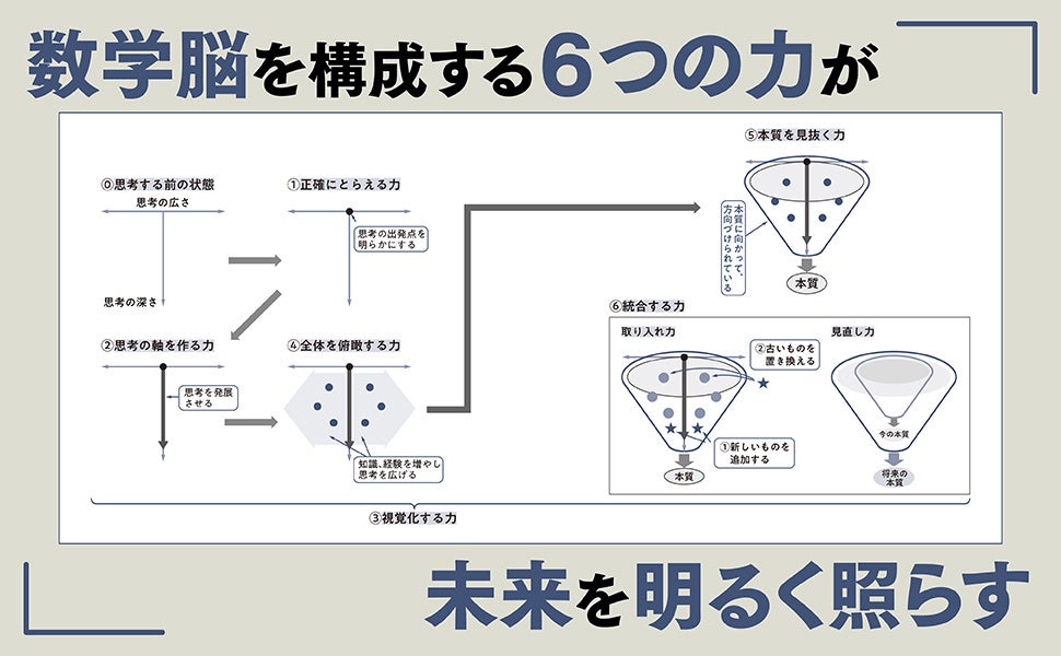 この6つの構成要素からなる「数学脳」は、物事の意味を理解し、本質を考え、発展させるための頭脳の働きであり、「数学脳さえ身につけば大丈夫!」と言っても過言でないほど、社会人として身につけておくことが重要です。