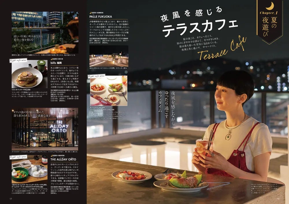 メイン特集では「九州の夜を楽しむ」をテーマに、夜風を感じる「テラスカフェ」、ドリンク片手にチルアウト「ナイトプール」、幻想的な海の世界を体験「夜の水族館」、熱く語らう夏時間「個性派の屋台呑み」、優しい光に包まれる「夏宵の灯りさんぽ」、背徳感がたまらない「夜パフェ」など、夏にこそ楽しみたい6テーマを掲載。一方、昼編はリラックスムード漂う「海カフェ」や、夏の陽射しに包まれる「阿蘇のドライブコース」など、4テーマの楽しみ方を紹介します。