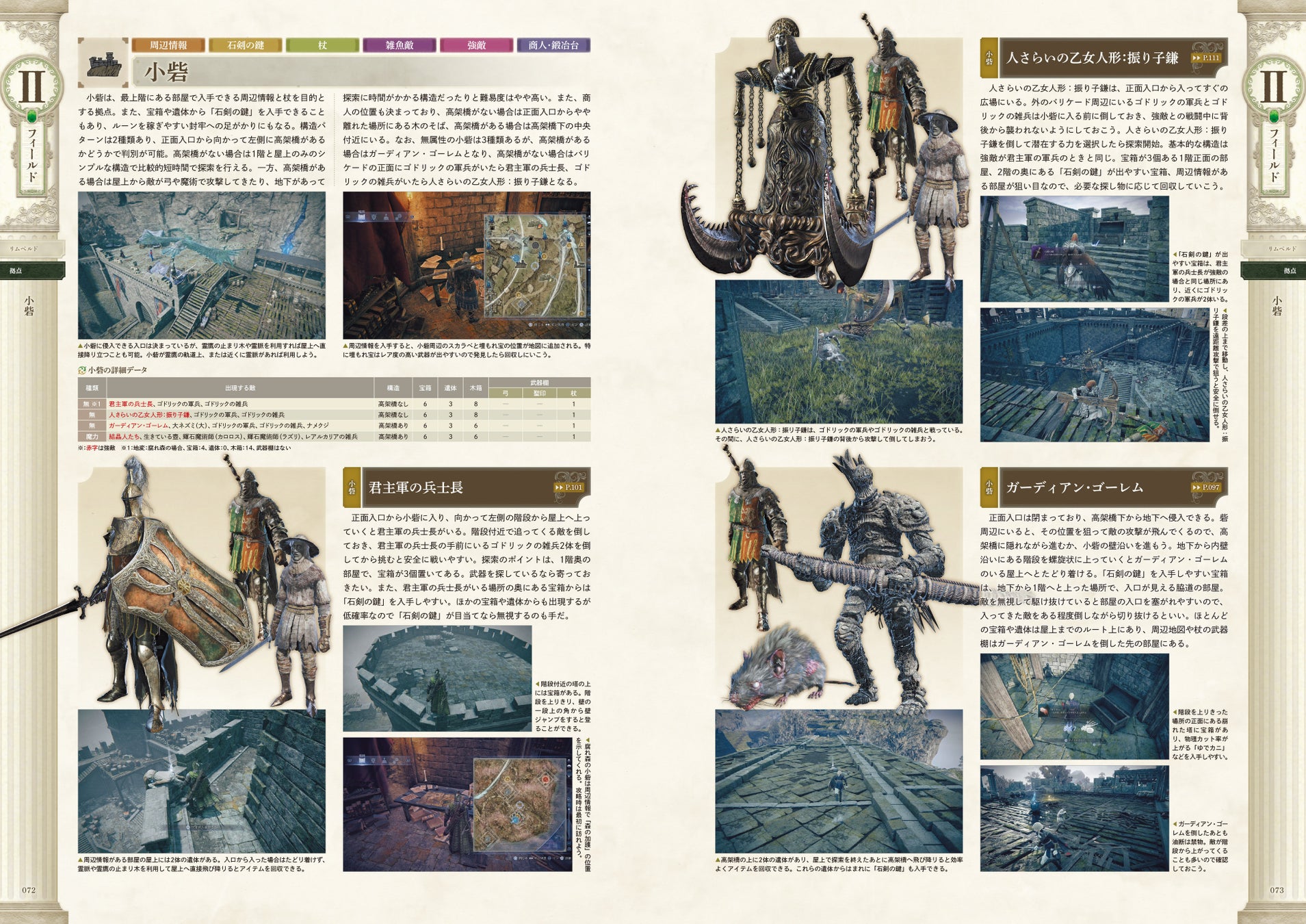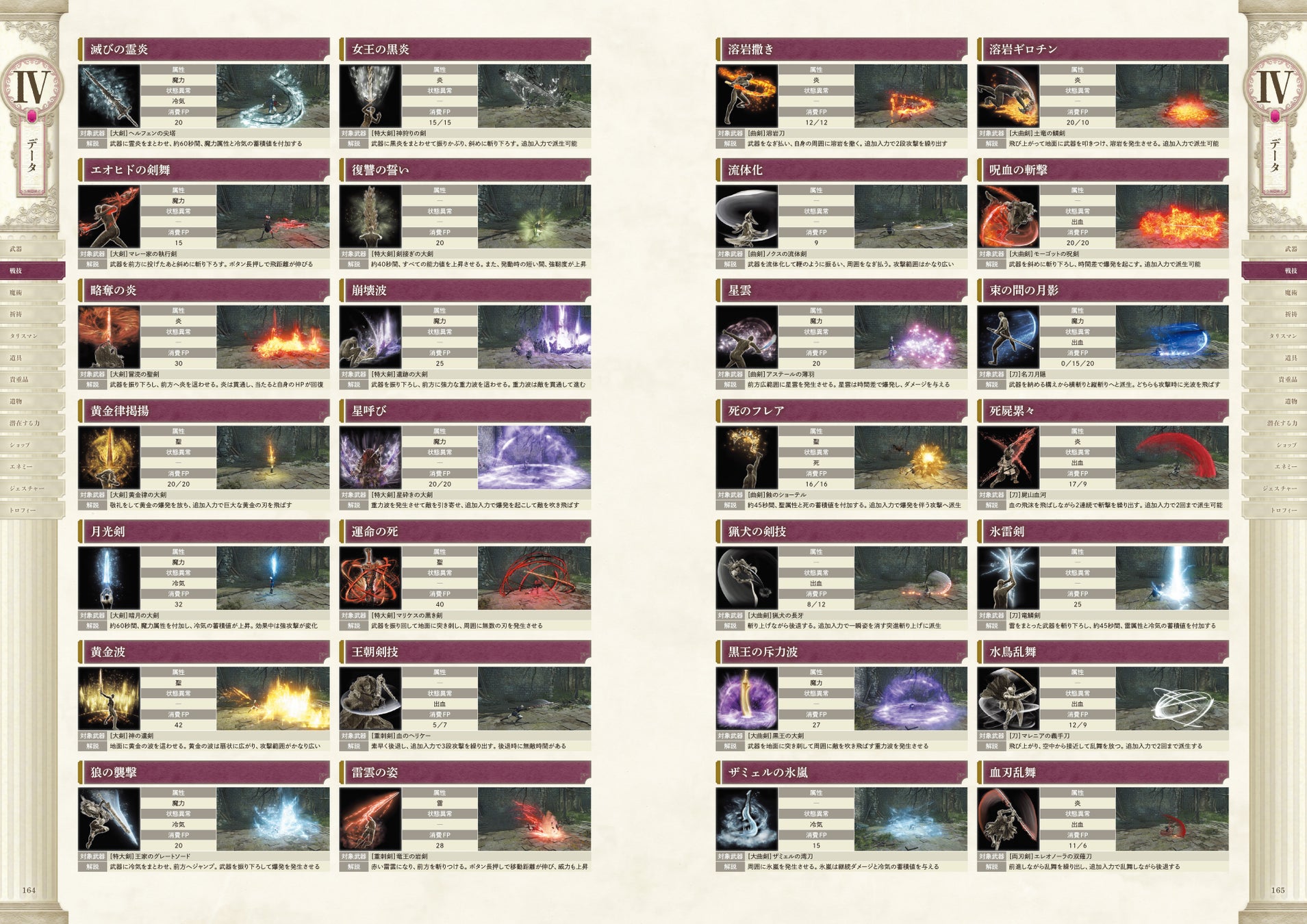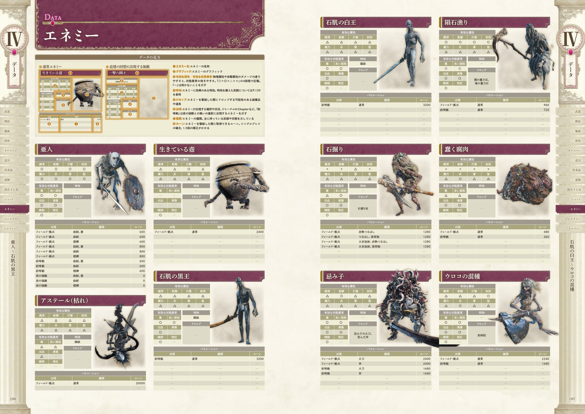 武器やタリスマンの性能、戦技・魔術・祈祷の効果に加え、遺物やその効果、武器の付帯効果、潜在する力など、ゲームプレイの中で入手できる可能性がある多彩な効果の一覧など、本作に登場するさまざまなデータを収録。