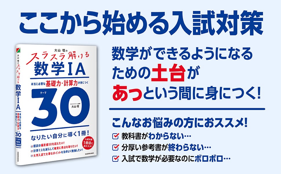 株式会社KADOKAWA(本社:東京都千代田区、取締役 代表執行役社長 CEO:夏野剛)は、『大山壇の スラスラ解ける数学IA 本当に必要な基礎力・計算力が身につくテーマ30』(著:大山壇)を2025年9月19日(金)に発売いたしました。