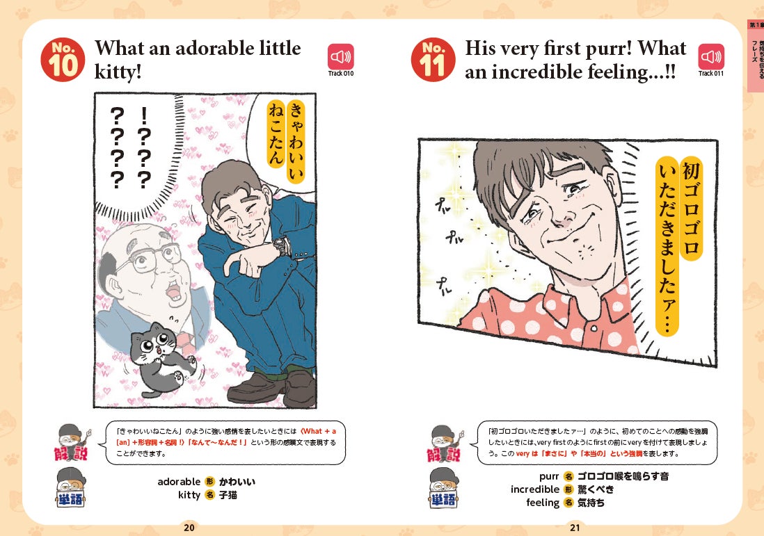 本書は『ねこに転生したおじさん』の珠玉の名場面を楽しみながら、英会話を学習できる一冊です。