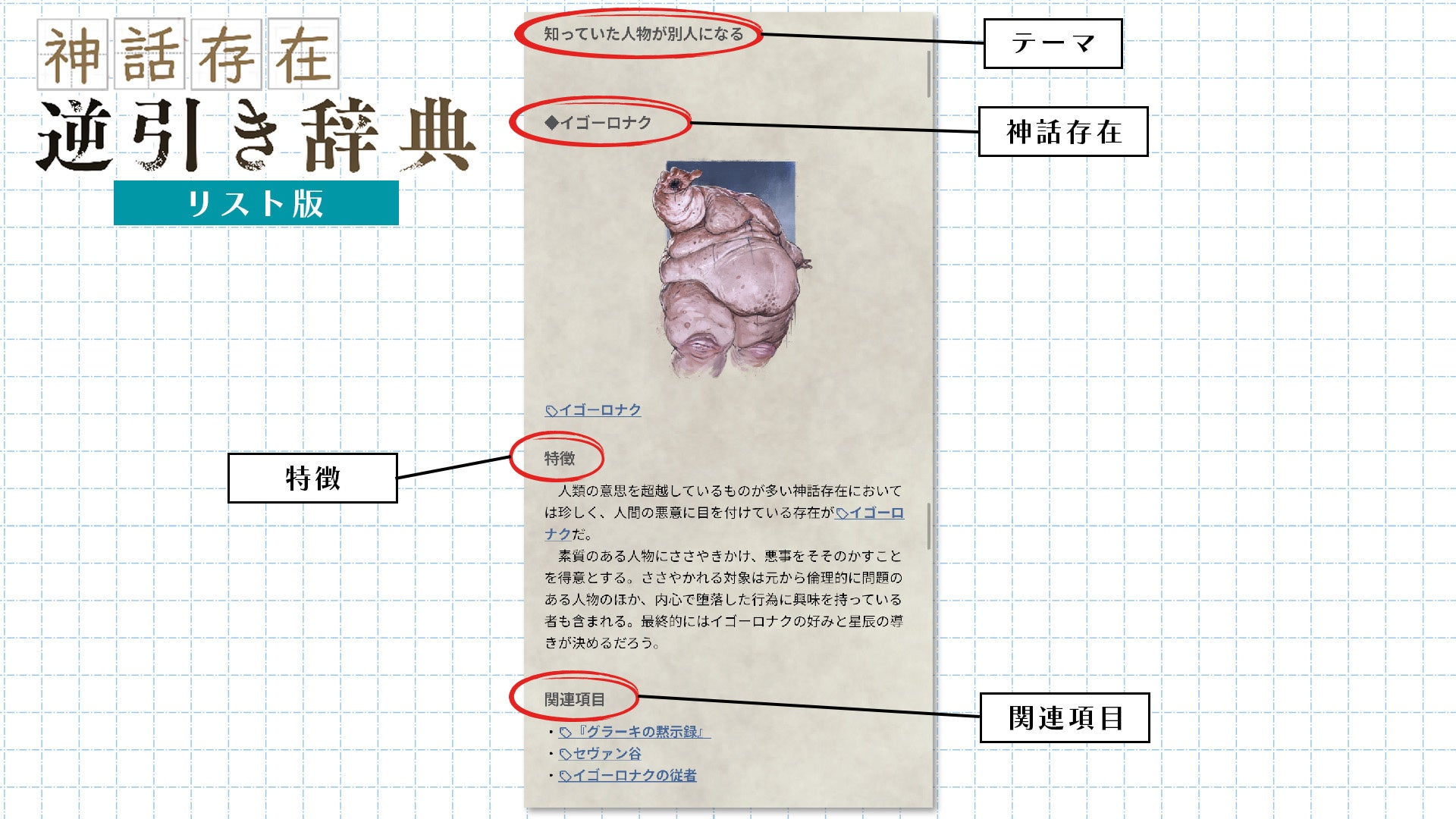 「神話存在逆引き辞典 β版」はテーマ別に神話存在を逆引きできるシナリオ制作者向けコンテンツです。「悪夢を見せる」などのテーマ別に複数の神話存在を紹介しているので、現象や与えたい恐怖などを起点にシナリオのアイデアを膨らませることができます。また、その神話存在に関連するキーワード情報やシナリオフックなども掲載しているため、幅広い視点でシナリオ制作のヒントを得ることも可能です。
