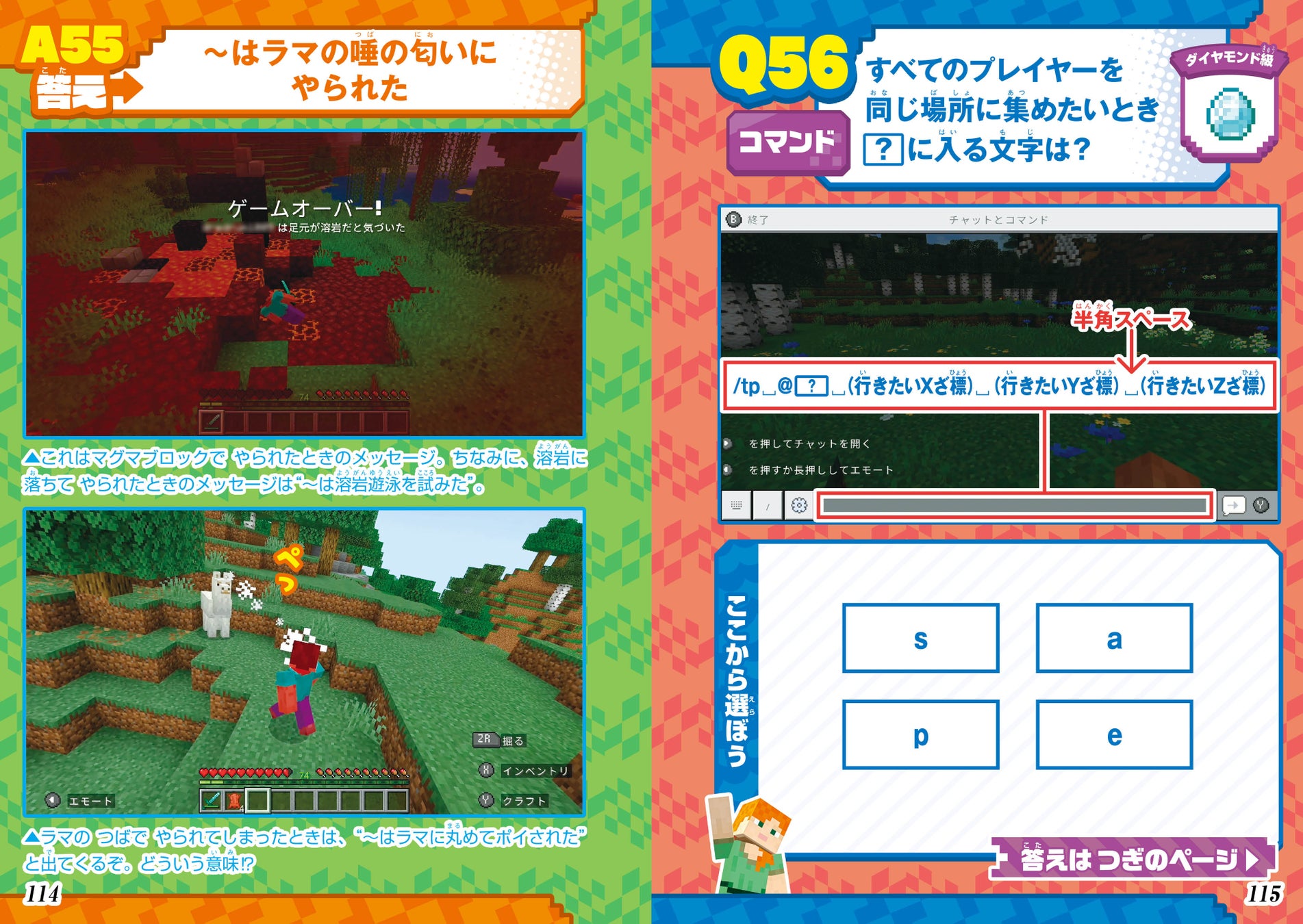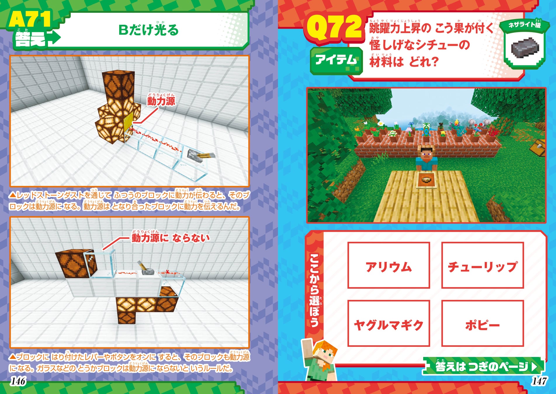 『マイクラ』のゲームに関するクイズを掲載、ページをめくるとクイズの答えとプラスの攻略情報がわかる、新しい攻略ブックが登場です。