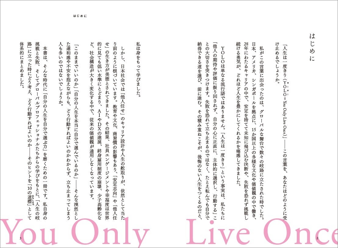 「YOLO=You Only Live Once(人生は一度きり)」=「他人の期待や評価に振り回されず、自分の心に正直に、主体的に選択し、行動する」という価値観を軸に、グローバル企業で活躍するプロフェッショナルたちの実例や著者自身の挑戦と成功のストーリーを、意志決定のヒント=「10の道標」として体系的に解説します。