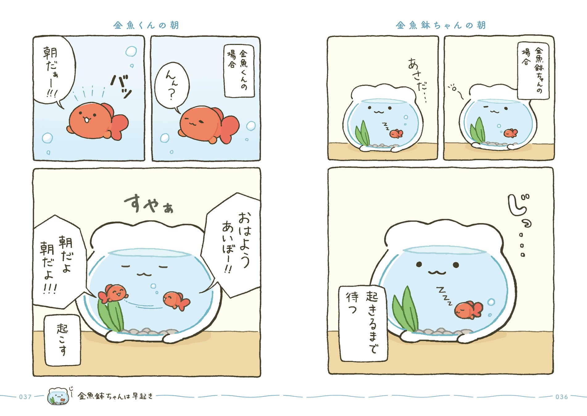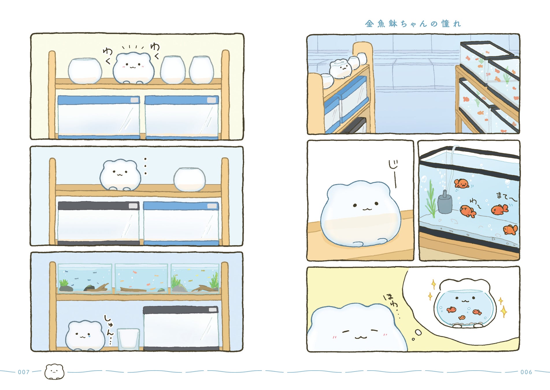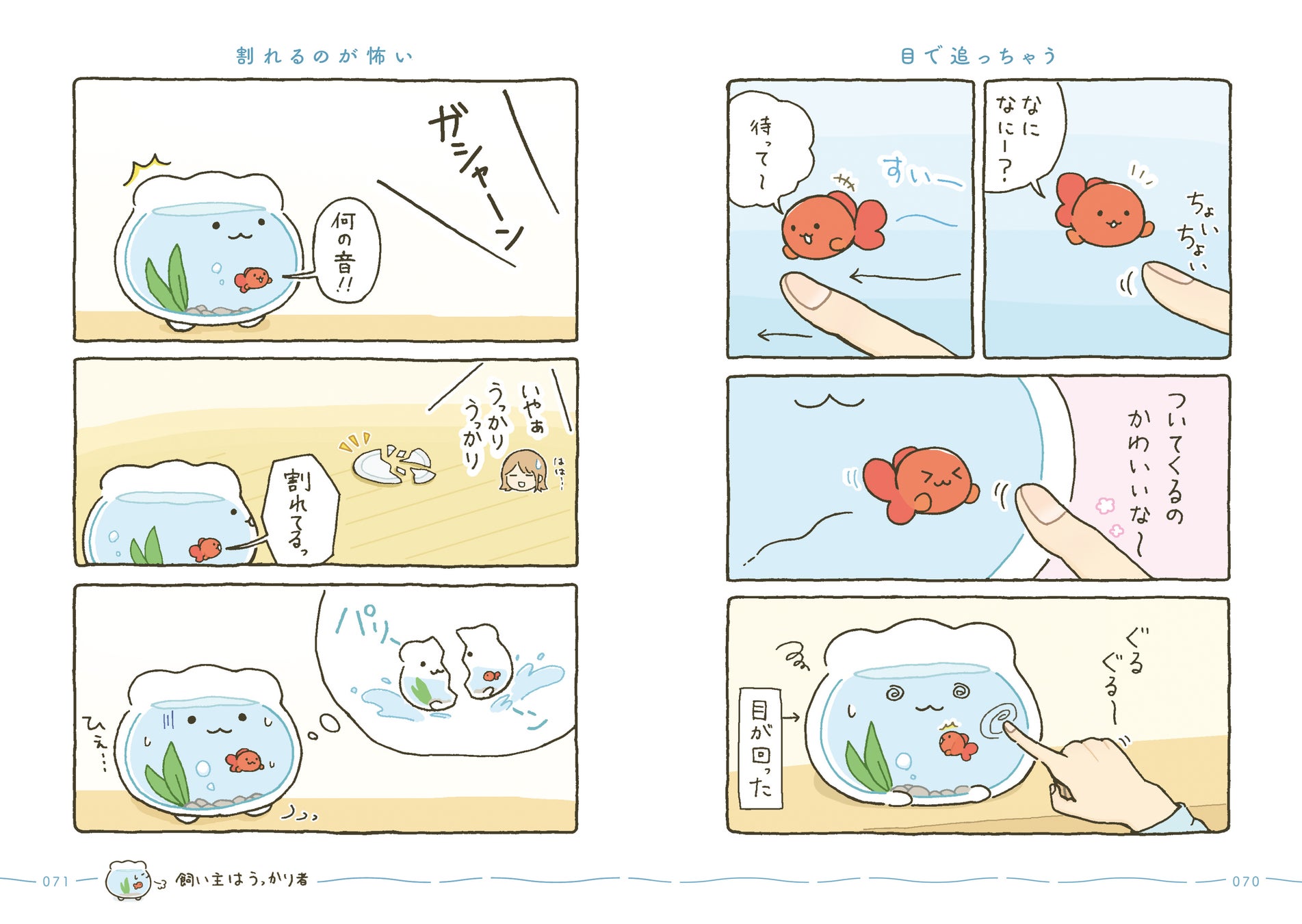 はじめてできた大切な大切なお友達とずーっといっしょの日常がはじまります。すぐに転んで泣いちゃうけれど、金魚くんのためにがんばれ金魚鉢ちゃん!