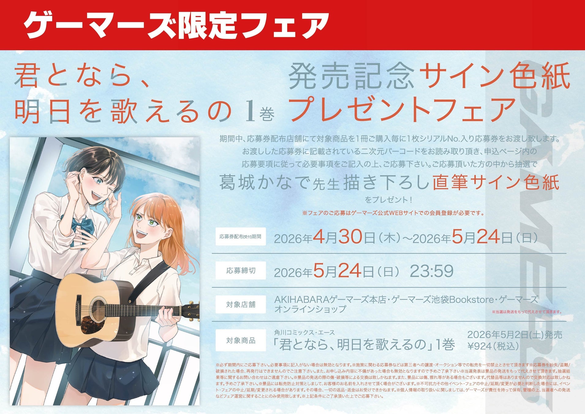株式会社KADOKAWA(本社:東京都千代田区、取締役 代表執行役社長 CEO:夏野剛)は、『君となら、明日を歌えるの』(著:葛城かなで)第1巻を2026年5月2日(土)に発売いたします。