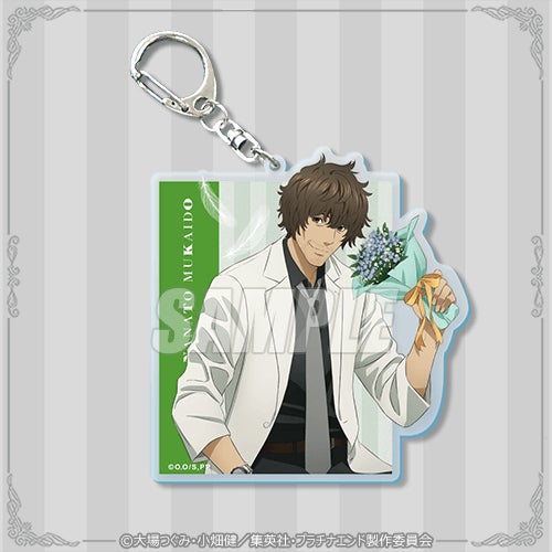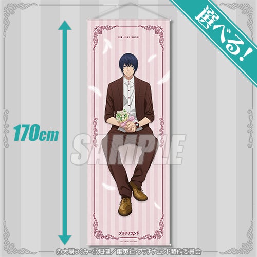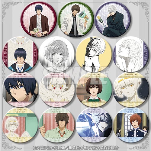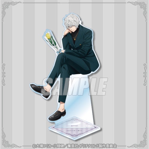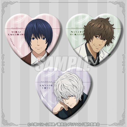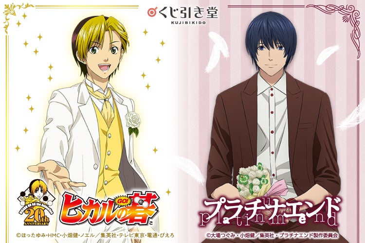 「プラチナエンド」からは色鮮やかな花束とスタイリッシュなスーツ姿の明日、六階堂、奏が描き下ろしで登場。様々な表情の場面写や、キャラクターデザインを務める大舘康二氏の特別イラストを使用したオリジナルグッズが登場。