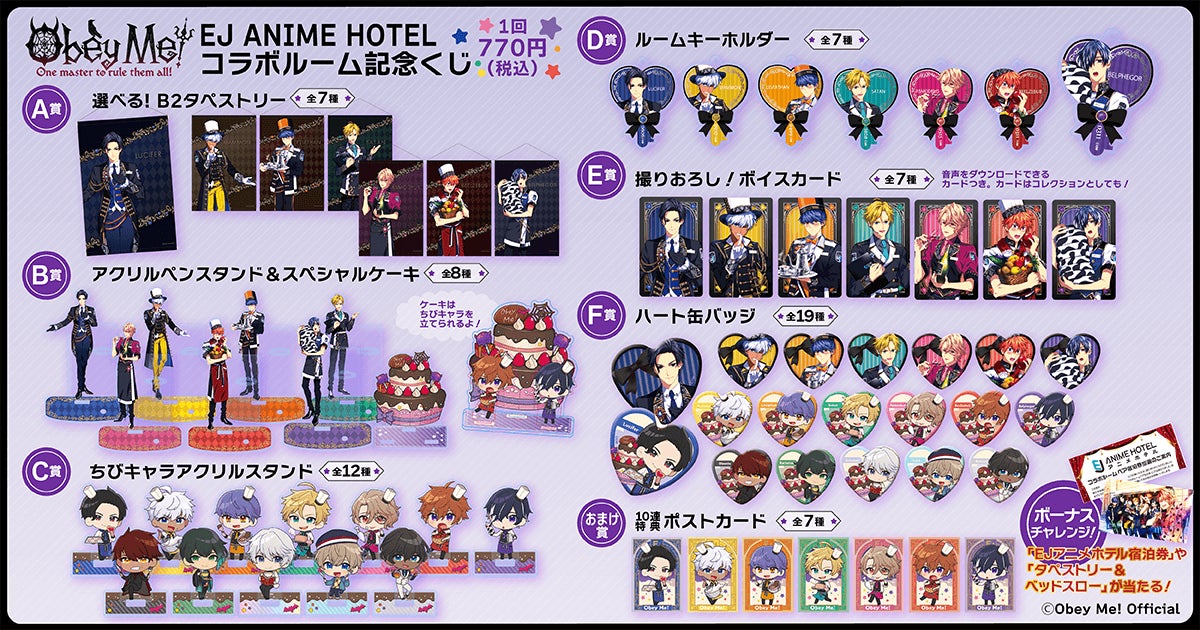 商品は、EJ アニメホテルとのコラボを記念した、ホテル描き下ろしイラストと、このくじのために描き起こしたちびキャライラストによるオリジナルグッズとなります。ホテルマンの衣装に身を包んだキャラクターたちの華麗なホテル描き下ろしイラスト商品や、録り下ろしボイスを使用した商品など盛りだくさん!また、ポストカードがもらえるオマケキャンペーンも実施!さらにボーナスチャレンジでは宿泊券が当たるチャンスも…! この機会をお見逃しなく!!