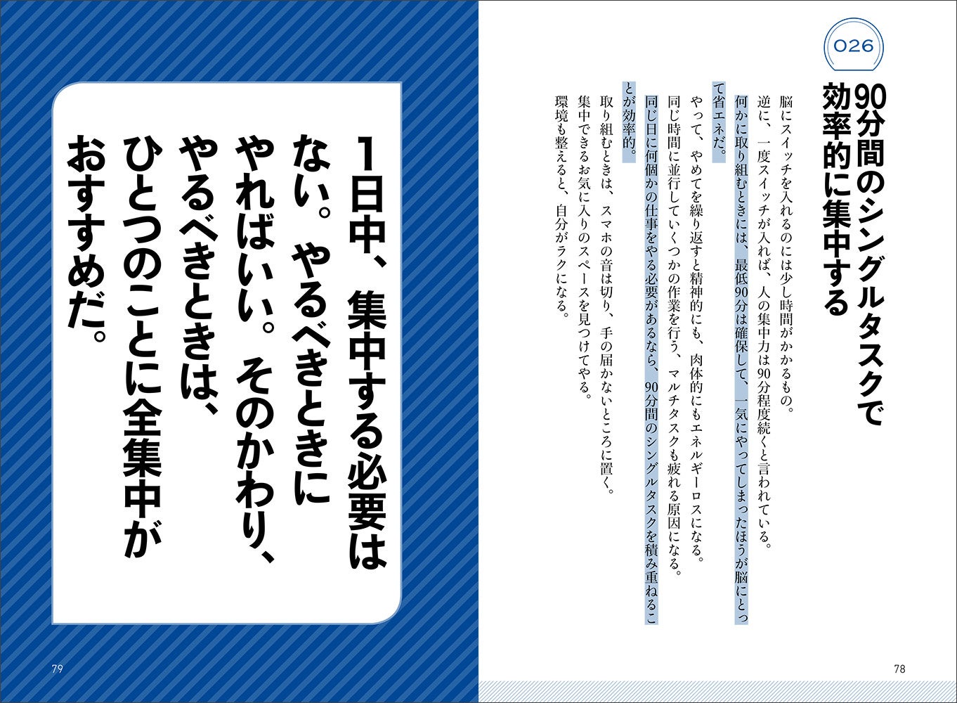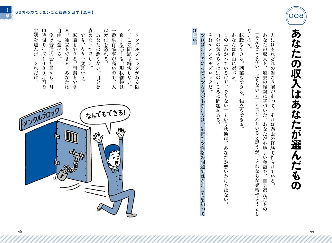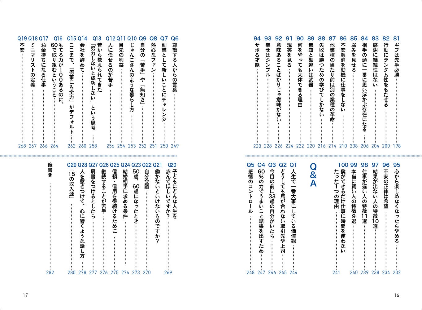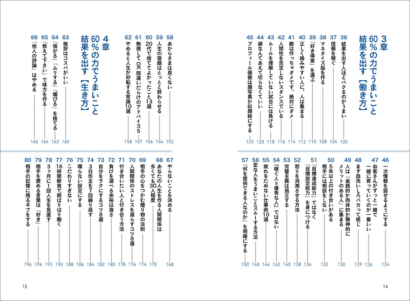 その1日、2日休んでも人生は終わらない/あなたの収入はあなたが選んだもの/継続力が高い人に共通している特徴7選/疲れる前に「休み」をスケジューリングする/時間に追われない仕事の仕方6選/うまいこと自分のキャパを増やす方法/無意識に時間を失う人の特徴10選/結果を出す人ほどパクるのがうまい/ルールを理解していない試合には負ける/「目標達成能力」ではなく「目標設定能力」を身につける/怒りを消滅させる方法/『稼ぐ人=優秀な人』ではない/疲れをためない仕事術10選/変な人をうまいことスルーする方法/無視してOK間違いだらけのアドバイス5選/挨拶はコスパがいい/「教えて下さい」で味方を作る/人間関係のストレスを減らすコツ8選/行動にランダム性をもたせる/他業種の当たり前は別の業種の革命/幸せはシンプル/サボる才能/僕ができるだけ仕事に時間を使わないたった1つの理由