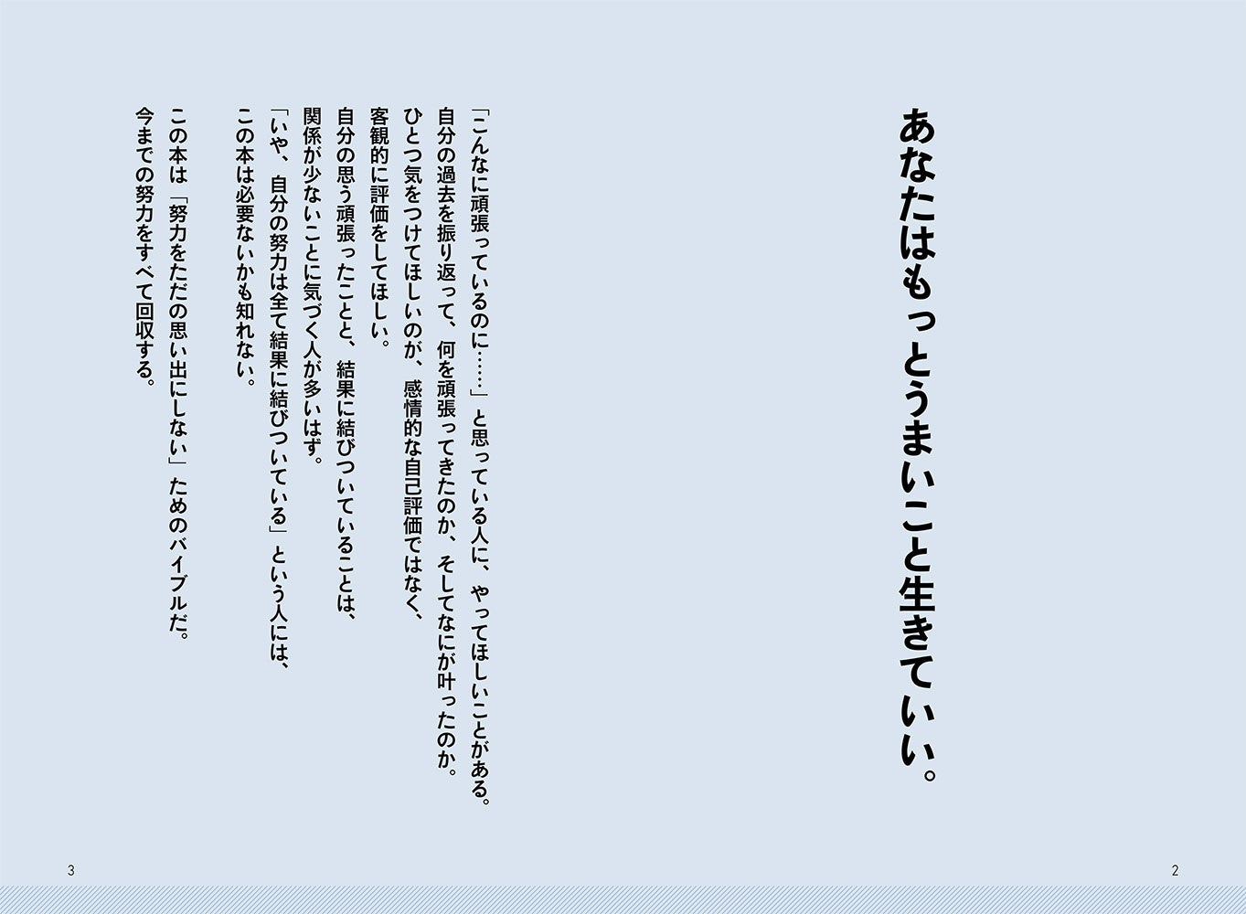 客観的に評価をしてほしい。自分の思う頑張ったことと、結果に結びついていることは、関係が少ないことに気づく人が多いはず。「いや、自分の努力は全て結果に結びついている」という人には、この本は必要ないかも知れない。この本は「努力をただの思い出にしない」ためのバイブルだ。今までの努力をすべて回収する。(前書きより)