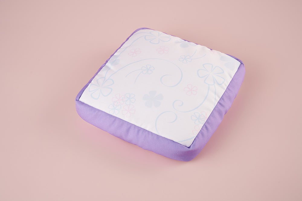 商品に標準で付属するクッションは、レムの髪飾りをモチーフにしたオリジナル柄のナノビーズクッションです。台座としてディスプレイに使用できます (サイズ約150✕150×45mm)。