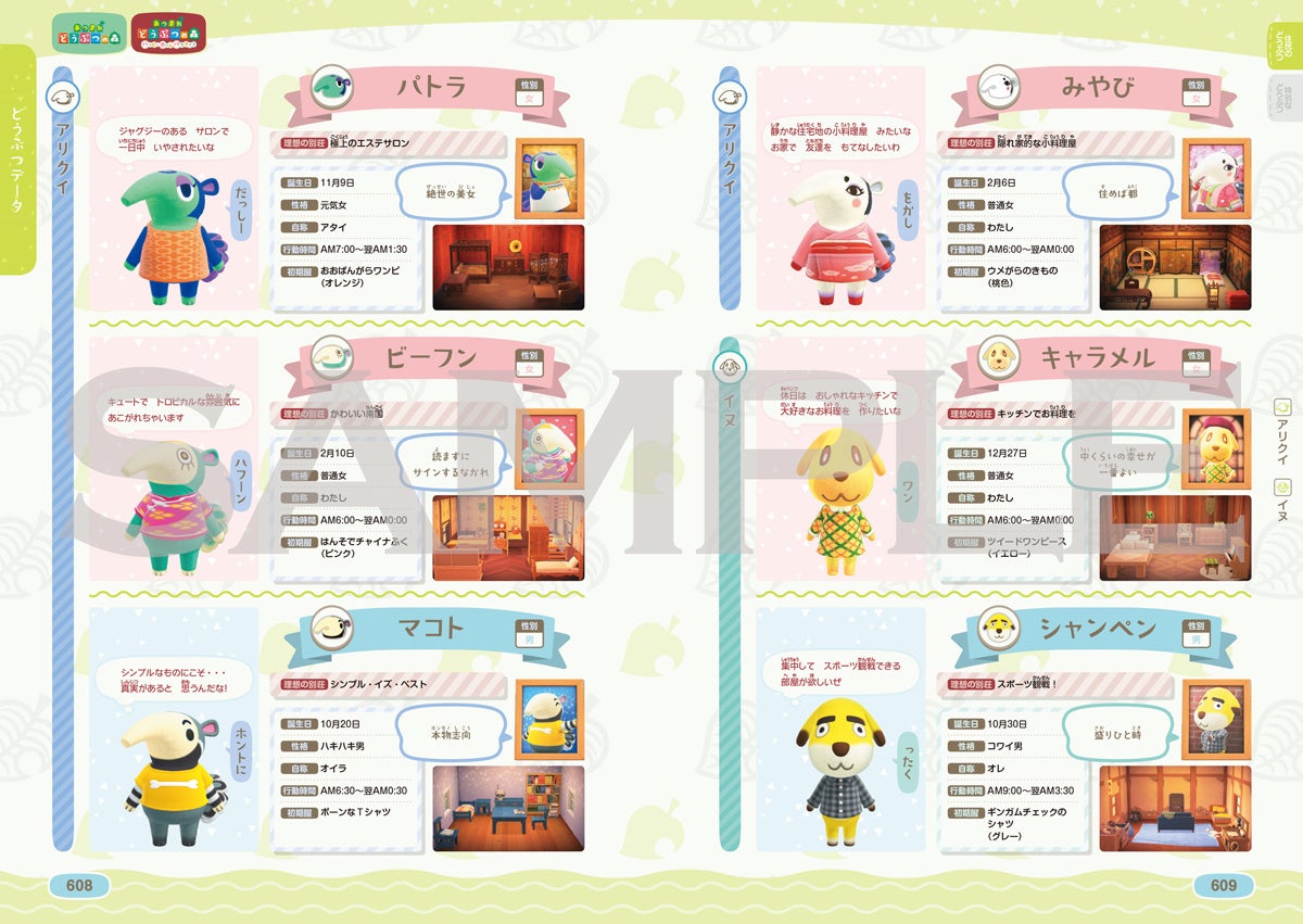 アップデートで追加された新どうぶつ&過去シリーズから再登場のどうぶつのデータを加えて、ゲームに登場するすべてのどうぶつのデータをカンペキ掲載! 移住初期の部屋のデザインや口ぐせ、好きな言葉や行動時間等のパーソナルデータに加え、「ハッピーホームパラダイス」に完全対応した別荘のイメージや理想の別荘の情報もバッチリ。