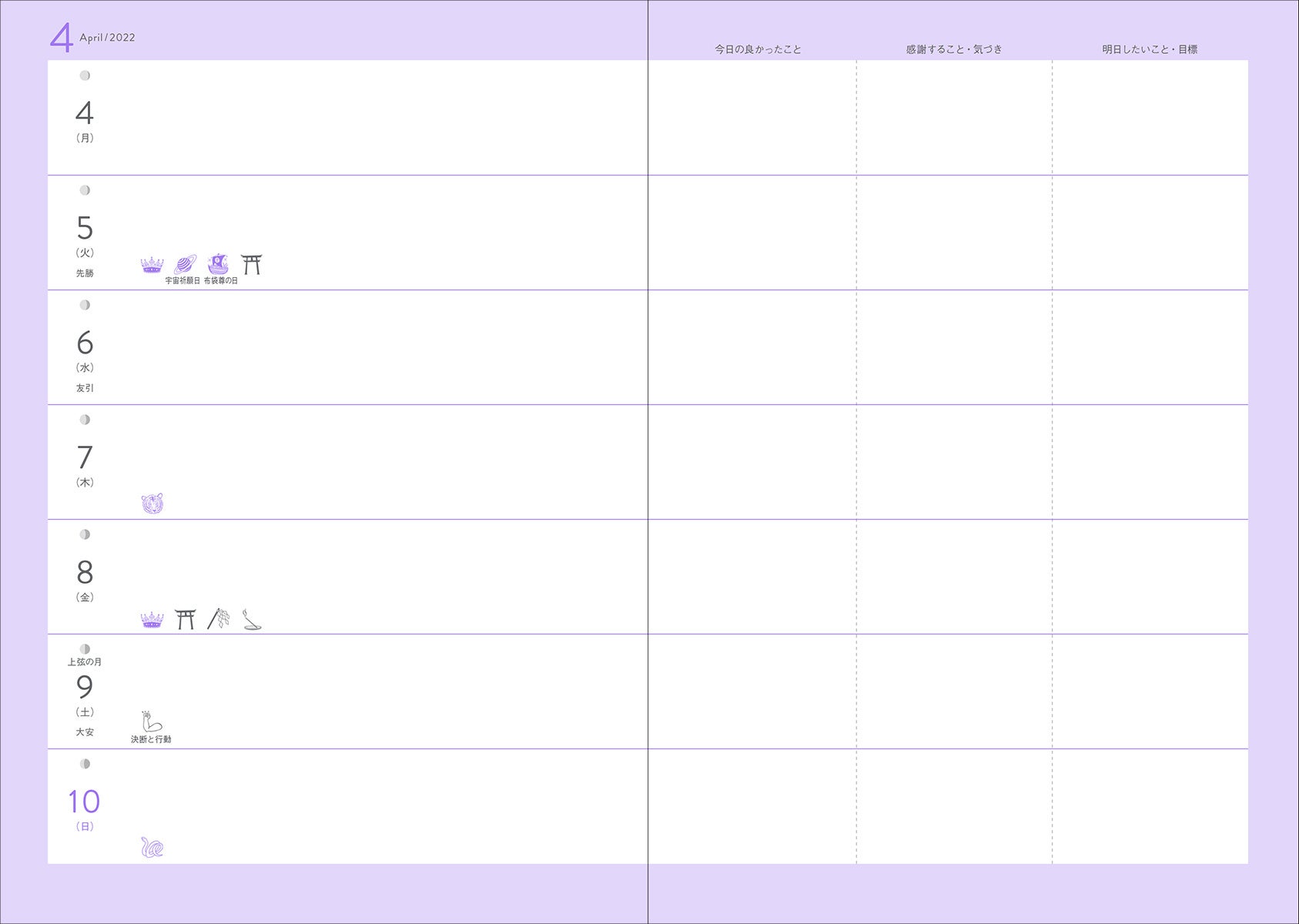 また、ウィークリーカレンダーには「今日の良かったこと」「感謝すること・気づき」を書く欄もあり、夜に1日を振り返るのに最適。