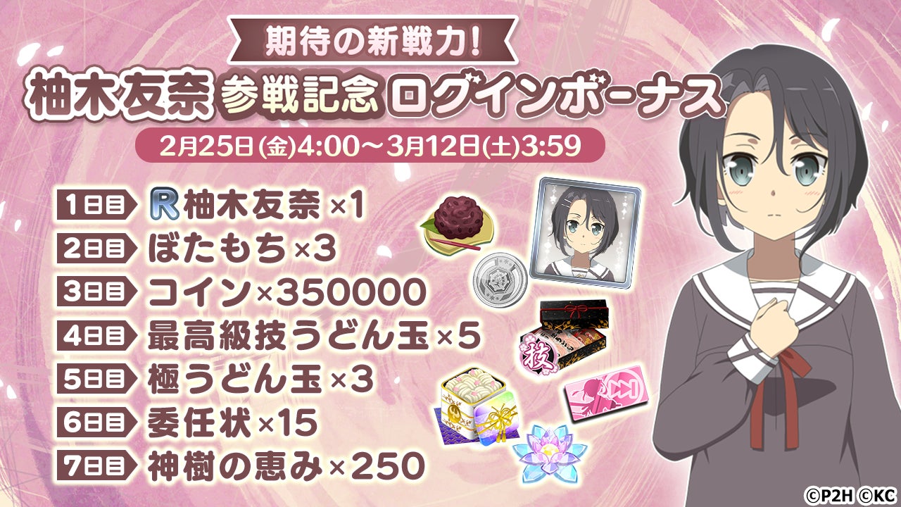 2月25日(金) 4:00より、柚木友奈の参戦を記念したログインボーナスを実施します!