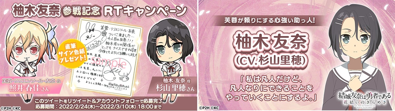 『ゆゆゆい』公式Twitterをフォロー&該当ツイートをリツイートすることで、柚木友奈役の杉山里穂さんと芙蓉・リリエンソール・友奈役の照井春佳さんのサイン色紙プレゼントキャンペーンに応募出来ます。