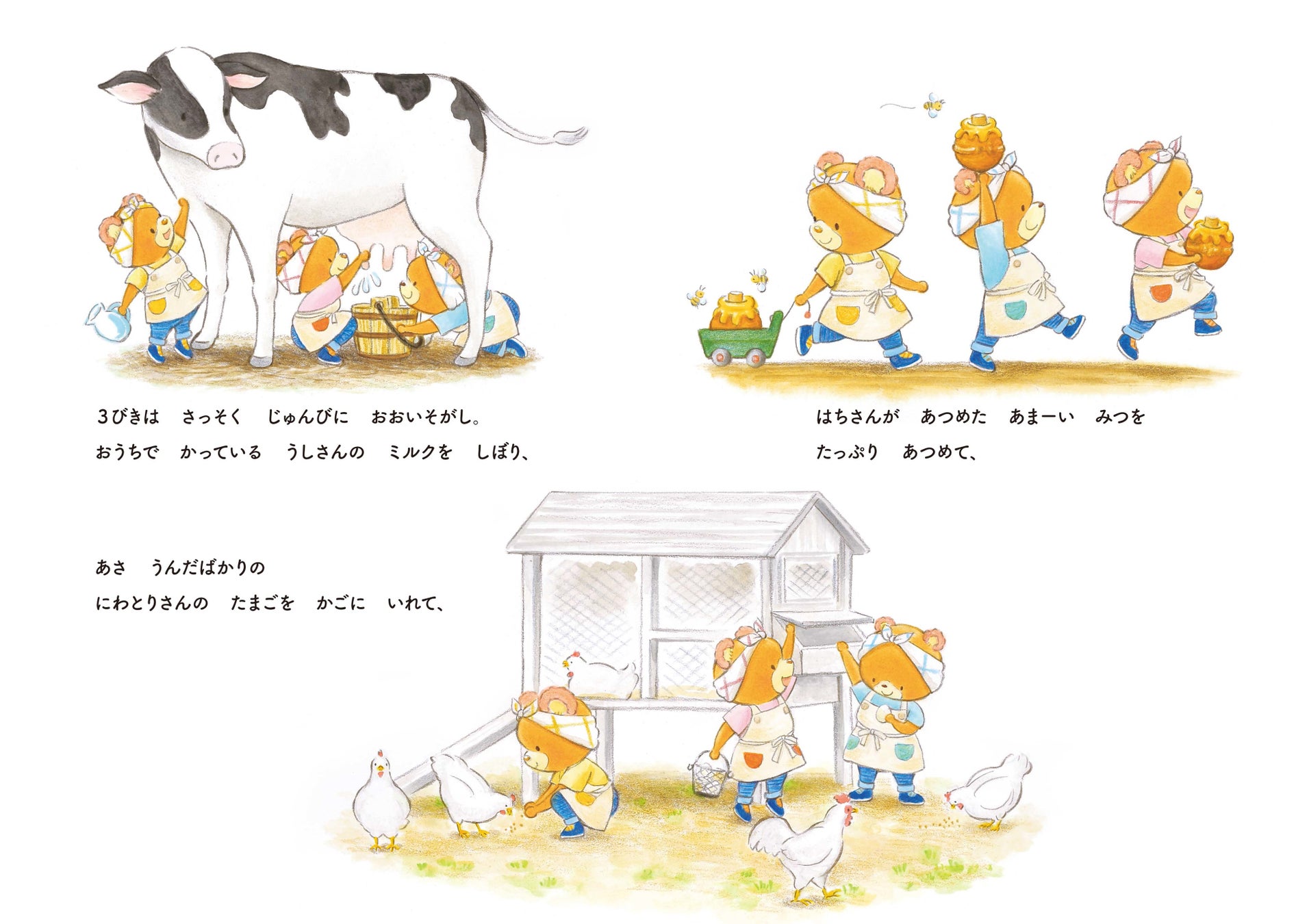 うしさんの ミルクを しぼり、にわとりさんの たまごや、はちさんの はちみつを集めて、