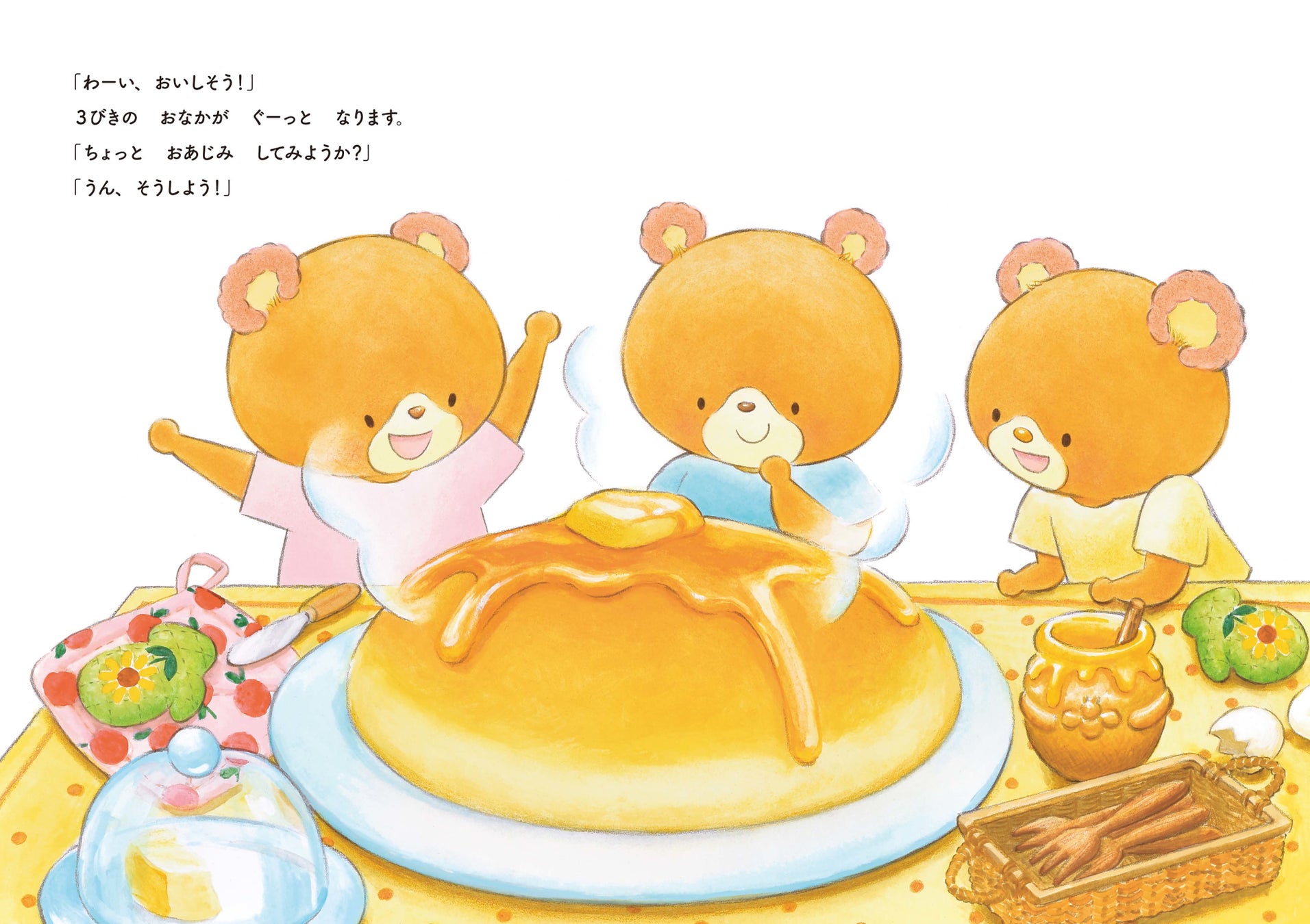 大きくて、ふわっふわのパンケーキ。みなさんから「おいしそう! たべたい!」って思ってもらえるよう、工夫しながら描きました。お話を楽しむ中で、好きな絵をたくさん見つけていただけたら、うれしいです。