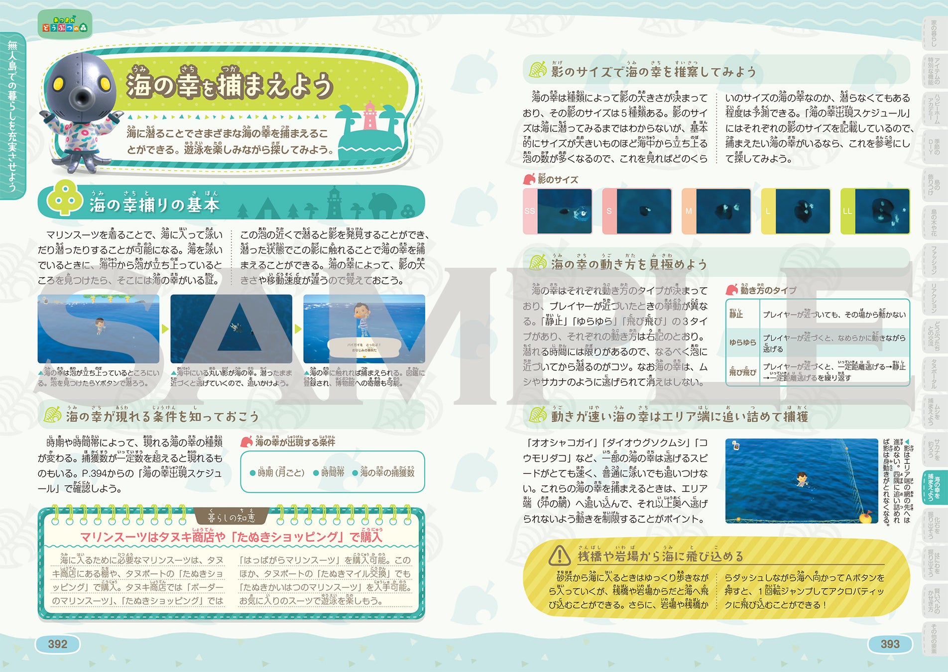 無料アップデートで新たに捕れるようになった海の幸。海の幸捕りの基本から、すべての海の幸の魚影のサイズ、動き方の特徴や捕獲の難易度、売値に出現スケジュールまで、知りたいことがカンペキにわかります。