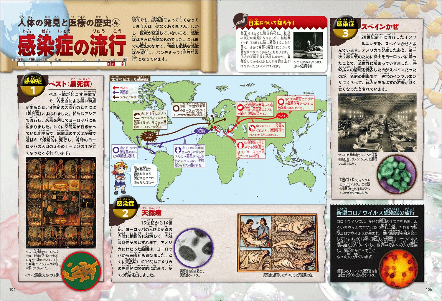 各章の章末には「人体の発見と医療の歴史」コラムが掲載され、これまでどのように人のからだについて明らかになり、医学が発展したかの世界史を学ぶこともできます。感染症の流行の歴史も取り上げています。