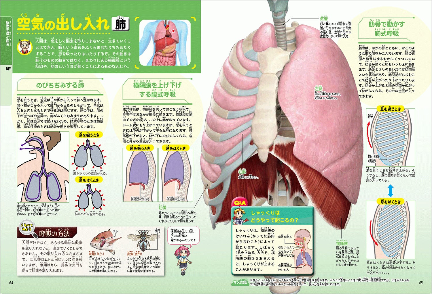 「しゃっくりはどうして起こるの?」「おなかがすくとグウグウ鳴るのはどうして?」など、からだにまつわる疑問に答えるミニコラムがたくさん載っています。動物との比較コーナーや、豆ちしきもたっぷり!
