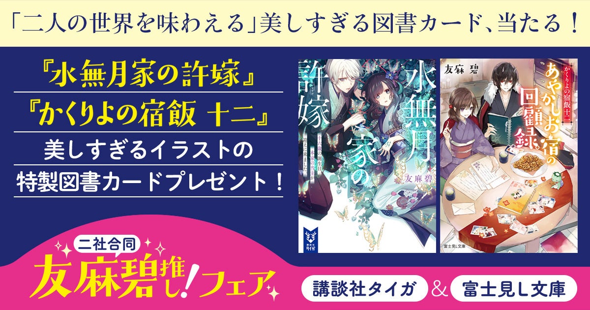 特定の書店店舗でフェア対象書目をご購入いただくと、友麻碧書き下ろしのショートストーリーを4編収録した小冊子をプレゼントいたします。小冊子には新刊発売の『かくりよの宿飯』『水無月家の許嫁』だけでなく、